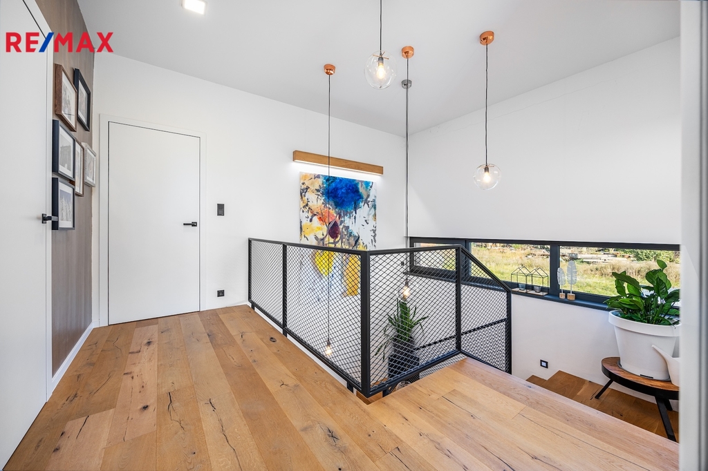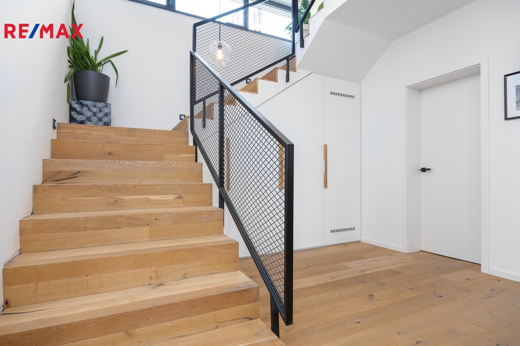 Podlaží jsou propojena samonosným schodištěm s dřevěnými stupni.