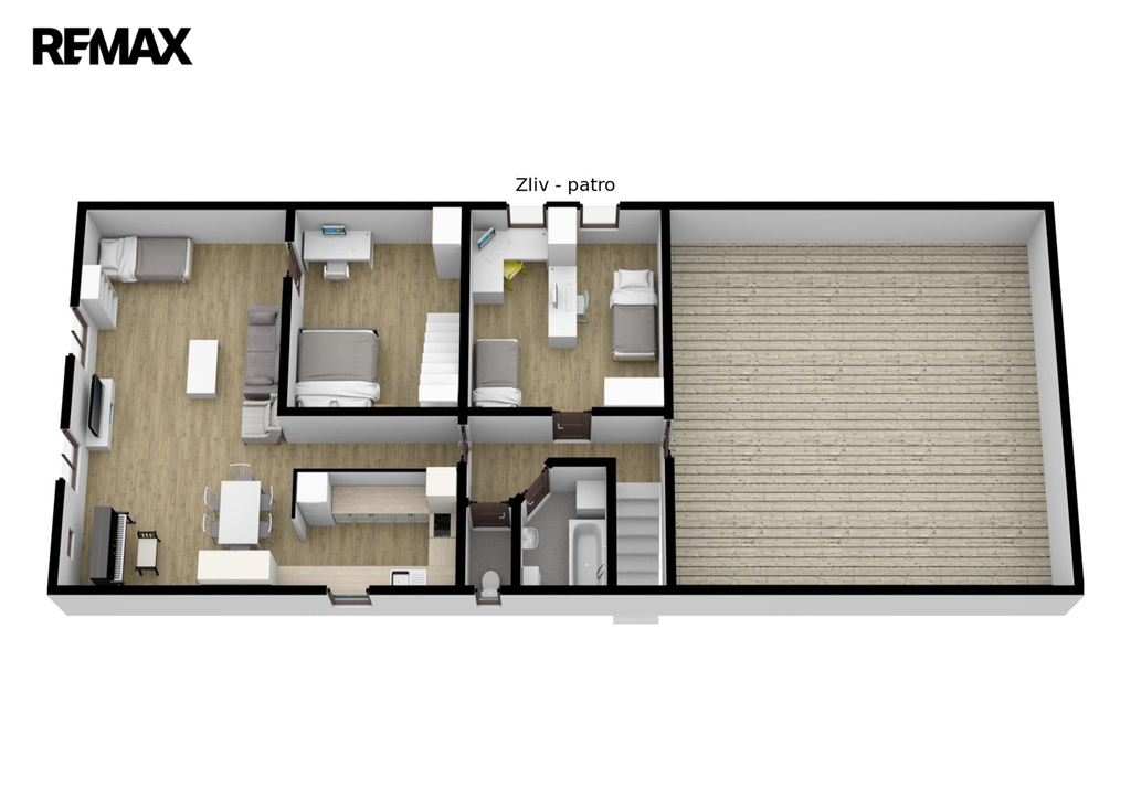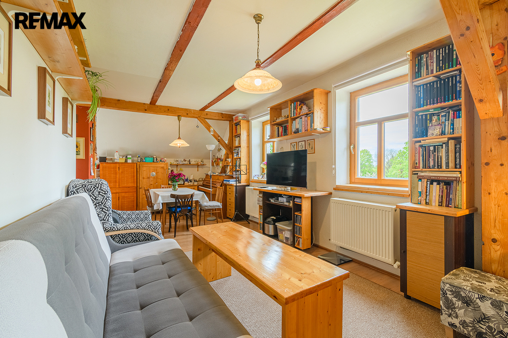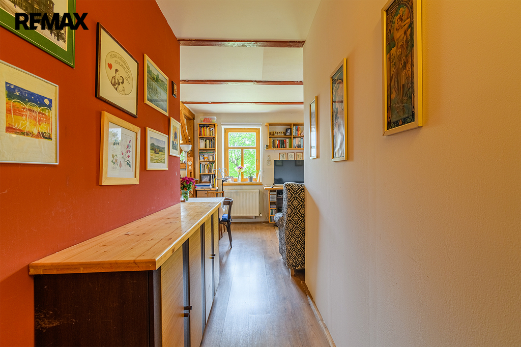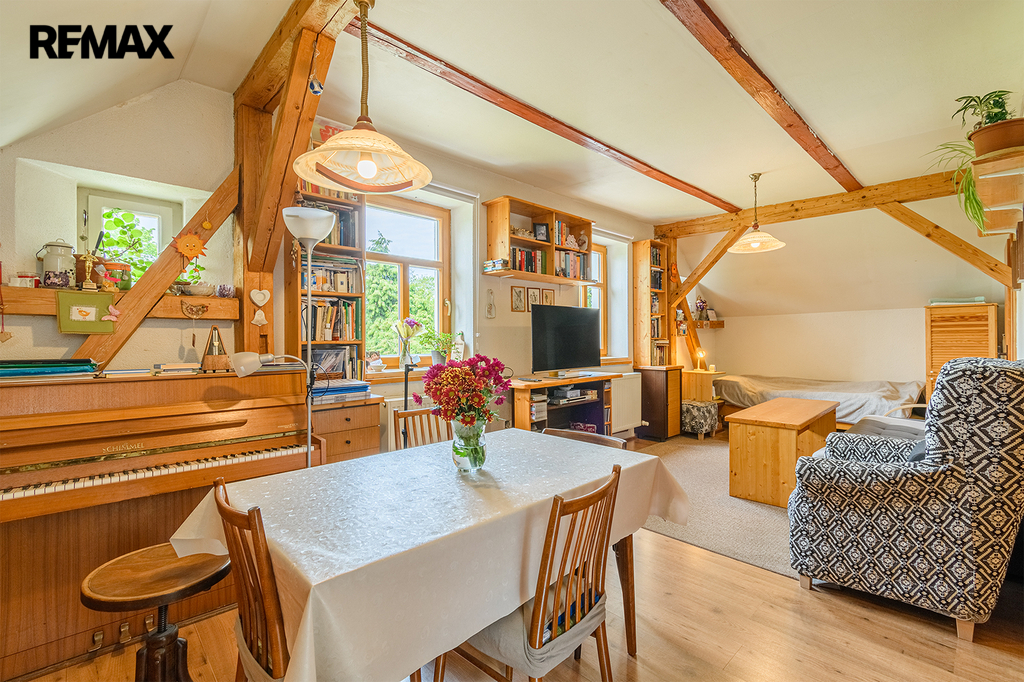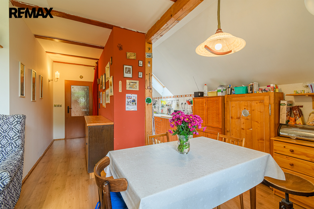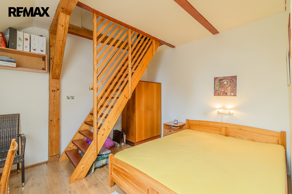 Dalším obytným prostorem o dispozici 3+kk je horní patro domu, které prošlo v roce 2010 rozsáhlou rekonstrukcí. Tato hezky řešená dispozice je rozšířena o další místnost vybudovanou v podkroví, přístupnou z jednoho z pokojů. Pojetí této povedené rekonstrukce krásně navazuje na styl přízemí domu a podtrhuje celkový dojem nemovitosti.