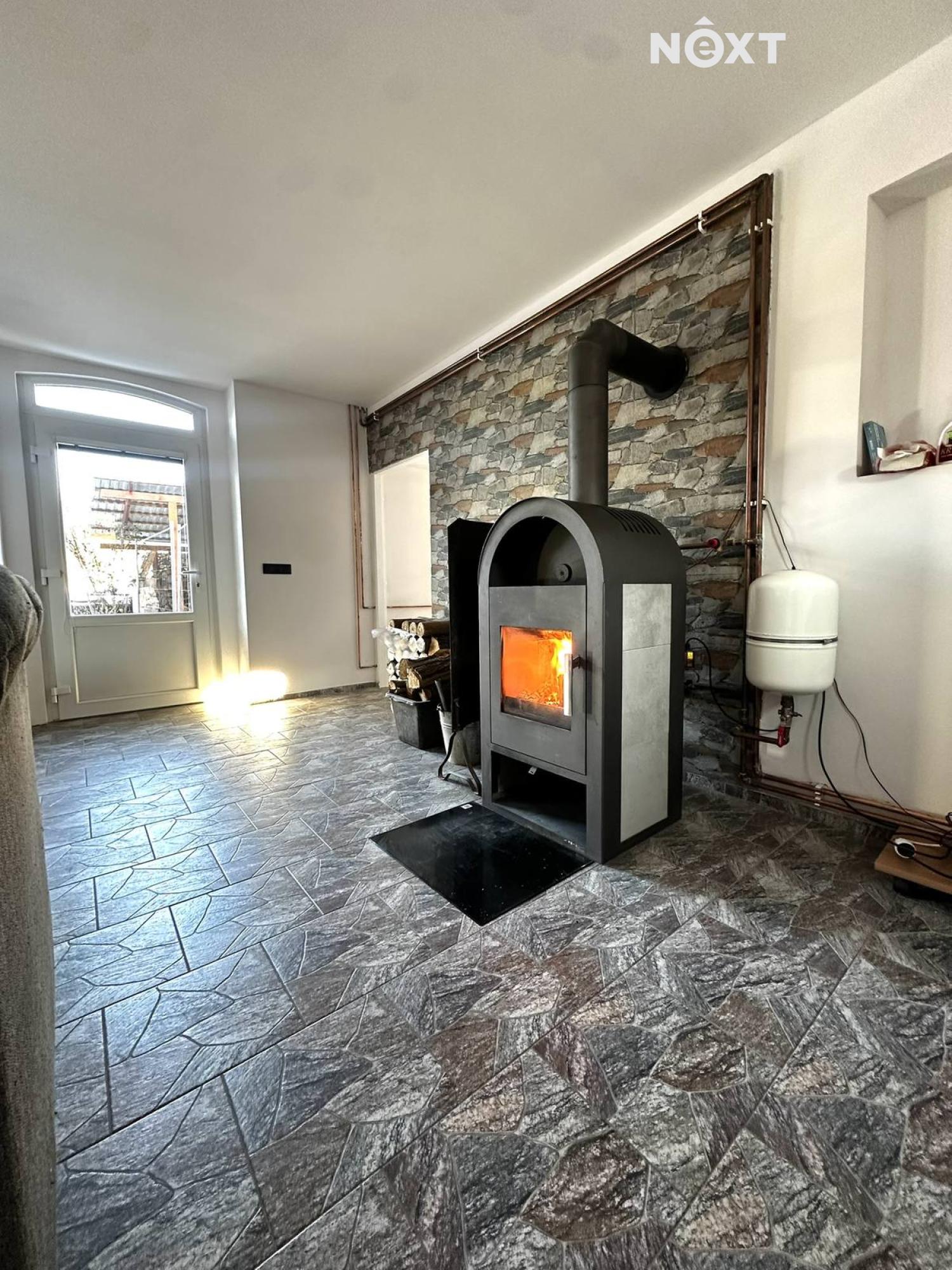 Částečně zařízený byt nabízí prostornou halu, obývací pokoj s krbem a kuchyní s vestavěnou linkou (součástí el. sporák, trouba, myčka a lednice) a koupelnu s rohovou vanou. Dále se v bytové jednotce nachází 3 prostorné pokoje. V bytě jsou položeny plovoucí podlahy a dlažba. K dispozici satelit a internet. Možnost vytápění celého bytu krbem s výměníkem a možností skladování paliva venku pod pergolou, případně vevnitř. Druhá možnost vytápění je elektrokotlem. Parkování ve dvoře až na dvě auta. Jedná se o velmi klidnou lokalitu s dobrou dostupností do Slaného (15 min) i do Prahy (40 min).