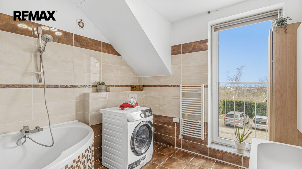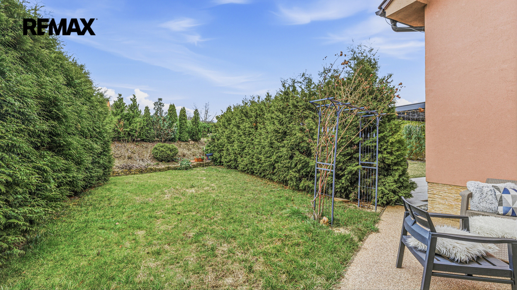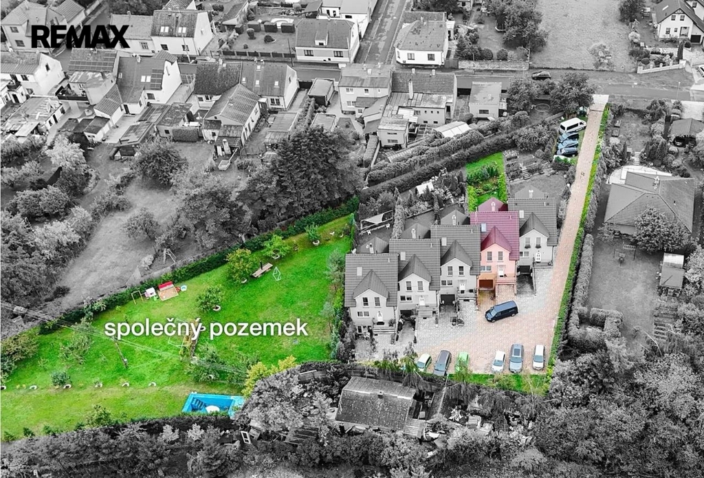 Mimo prostorné garáže jsou k dispozici ještě dvě venkovní stání na pozemku. Dům je napojen na obecní vodovod, výhodou je také vlastní voda z vrtu. Odpadní vody jsou řešeny domovní čističkou. Dům má nízké provozní náklady. Velkou předností je společný pozemek o výměře téměř 2.000 m², který je k užívání společně se čtyřmi sousedními domy.