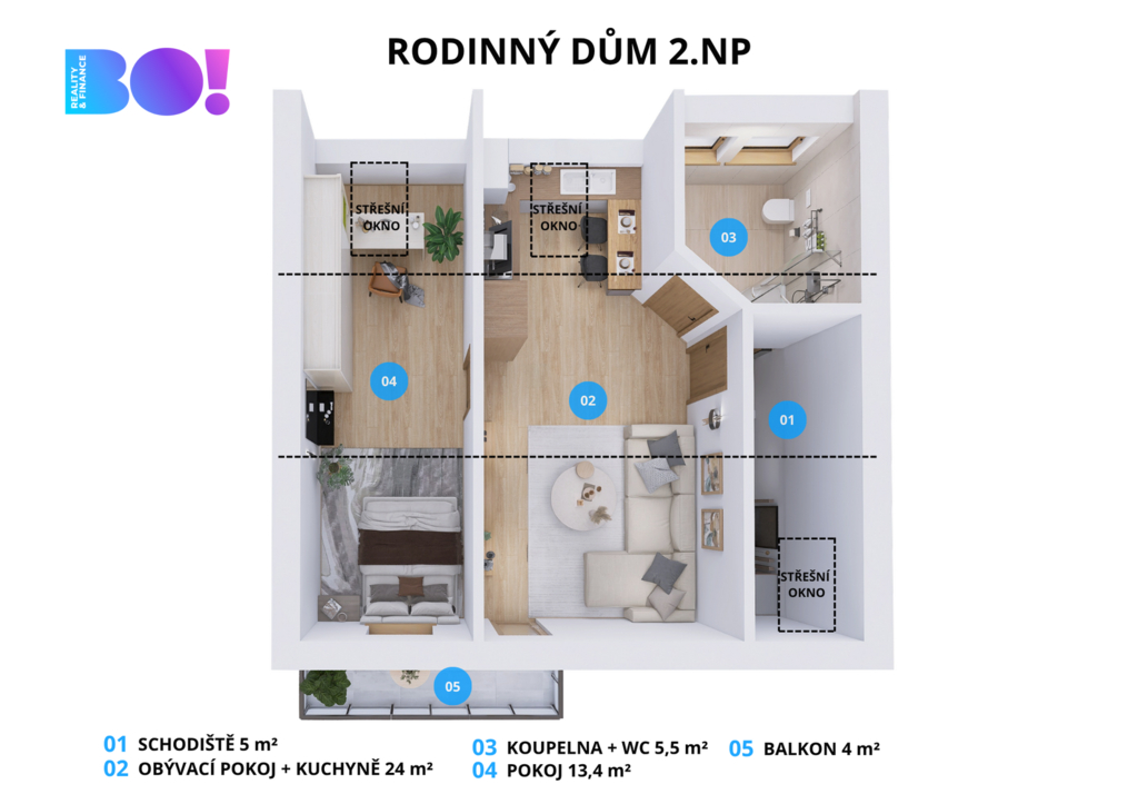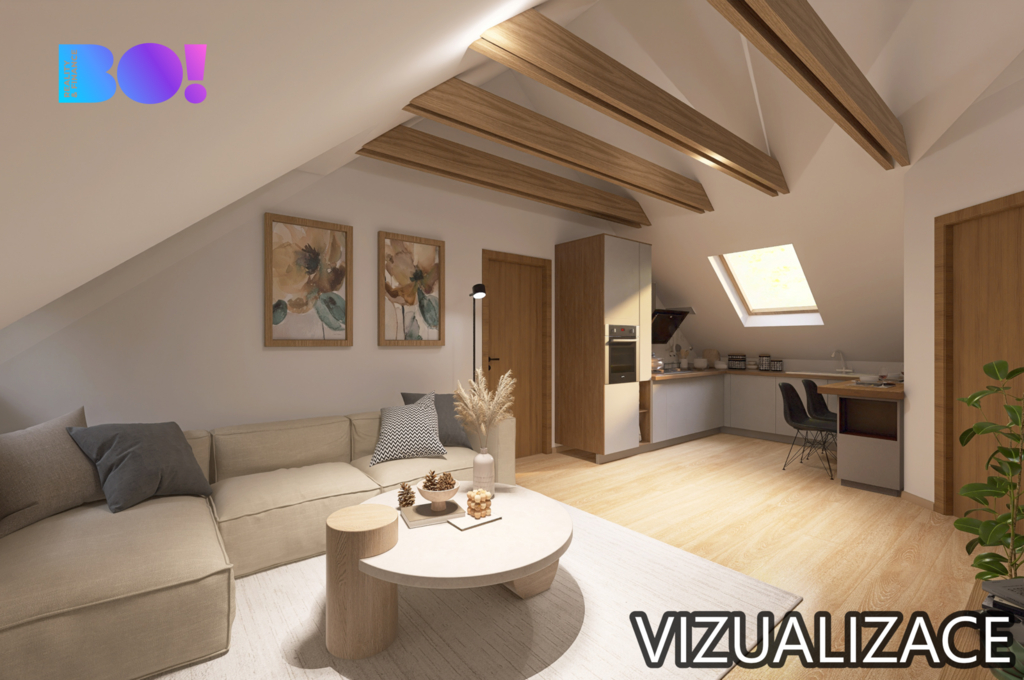 Horní patro je řešeno jako velkometrážní 1+kk s příjemným otevřeným prostorem, který působí vzdušně a světle. Zároveň se zde nabízí možnost úpravy na praktičtější 2+kk, takže nový majitel může dispozici přizpůsobit vlastním potřebám. Možnosti můžete vidět na vizualizaci a videu.