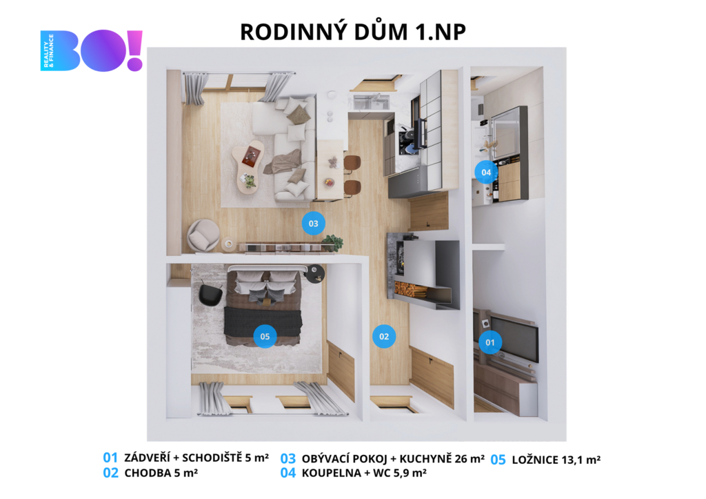 V přízemí se nachází dispozice 2+kk, která poskytuje pohodlné zázemí pro každodenní bydlení.