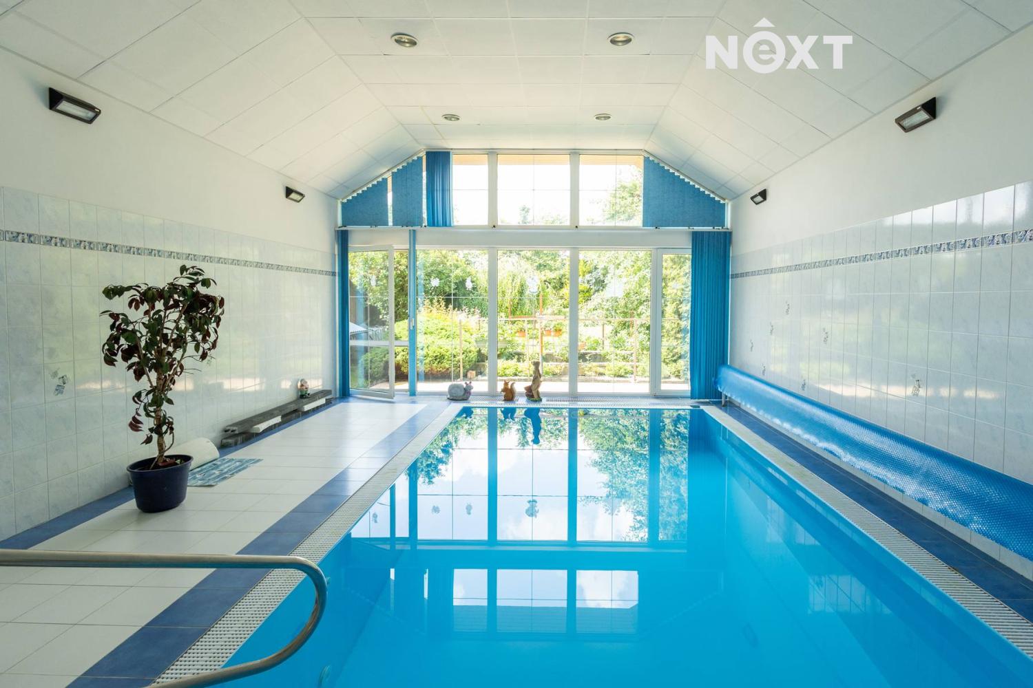 • Vnitřní vyhřívaný bazén s protiproudem (6×3 m) – ideální pro relax i aktivní plavání, který je propojen skleněnou stěnou s venkovní terasou orientovanou na západní stranu