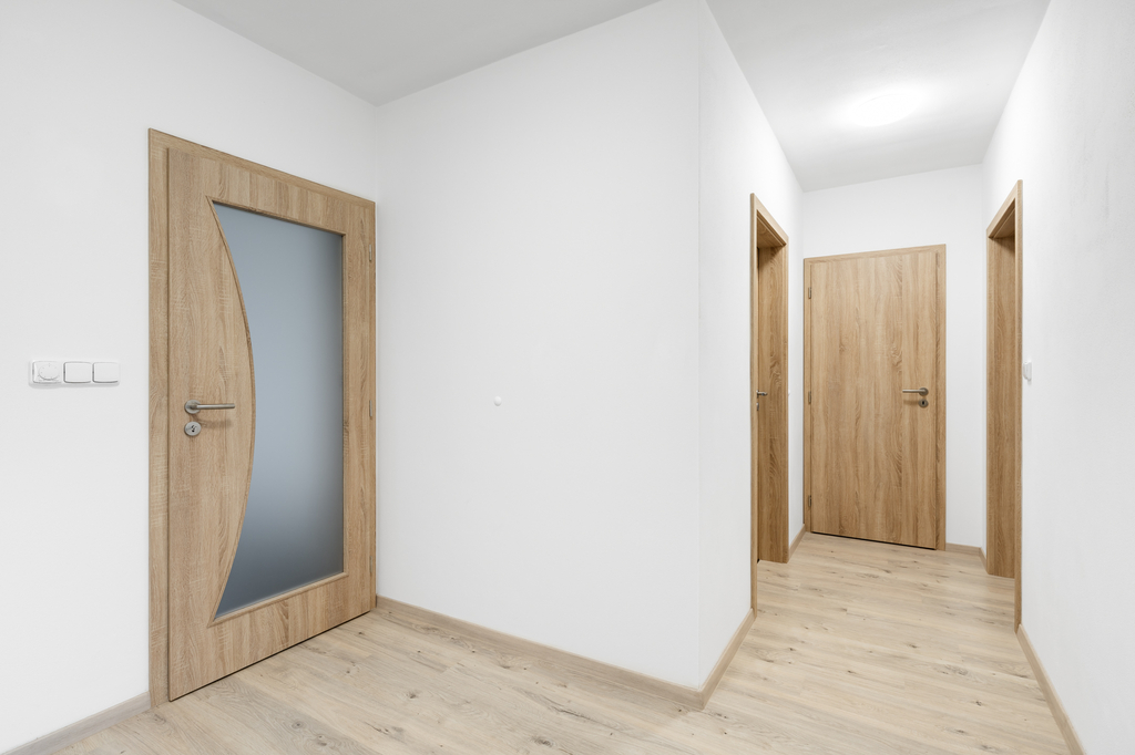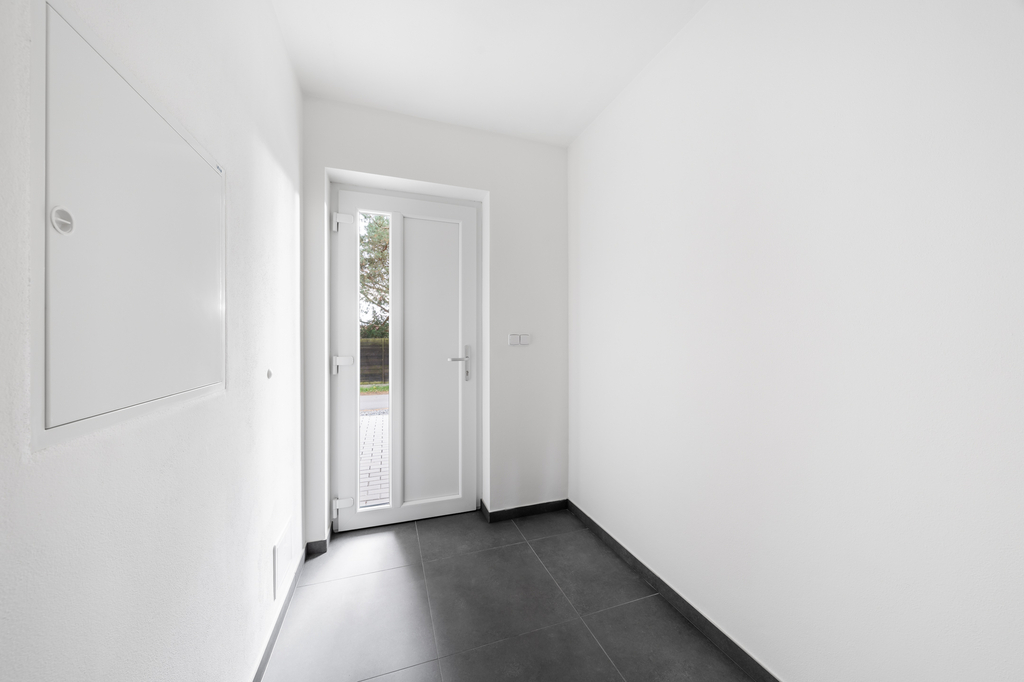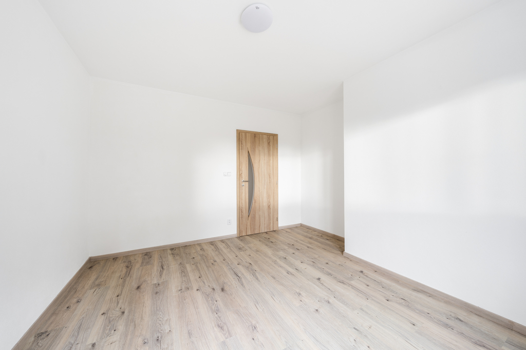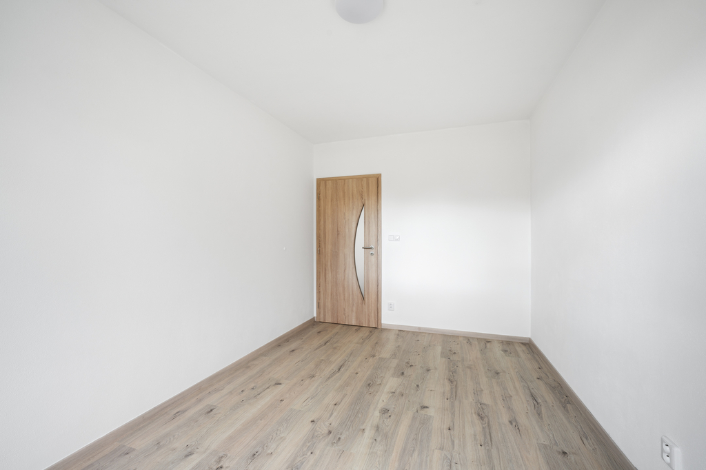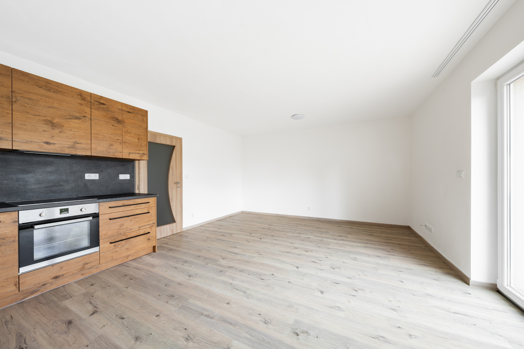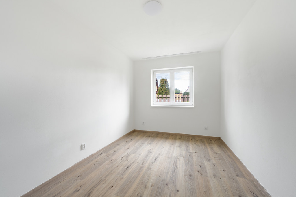 Dispozice bytu zahrnuje obývací pokoj s kuchyňským koutem, ložnici, dětský pokoj, chodbu, předsíň, koupelnu a oddělené WC. K bytu dále náleží komora (4 m2), která se nachází hned vedle bytu (není zachycena na fotografiích). Dominantou obývacího pokoje je velké francouzské okno, které prostor příjemně prosvětluje a zároveň umožňuje vstup na terasu (10 m2) s navazující předzahrádkou (70 m2).