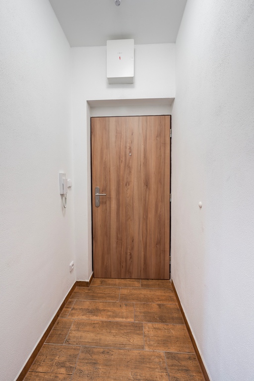 Dispozice zahrnuje obývací pokoj s kuchyňským koutem, ložnici, předsíň a koupelnu s toaletou. Velká francouzská okna v obývacím pokoji nejen příjemně prosvětlují tento prostor, ale zároveň umožňují vstup na prostorný balkon orientovaný do klidného vnitrobloku. K bytu náleží také sklepní kóje (2 m2).
