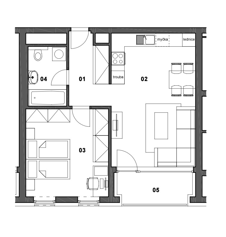 - Dispozice bytu: 2+kk