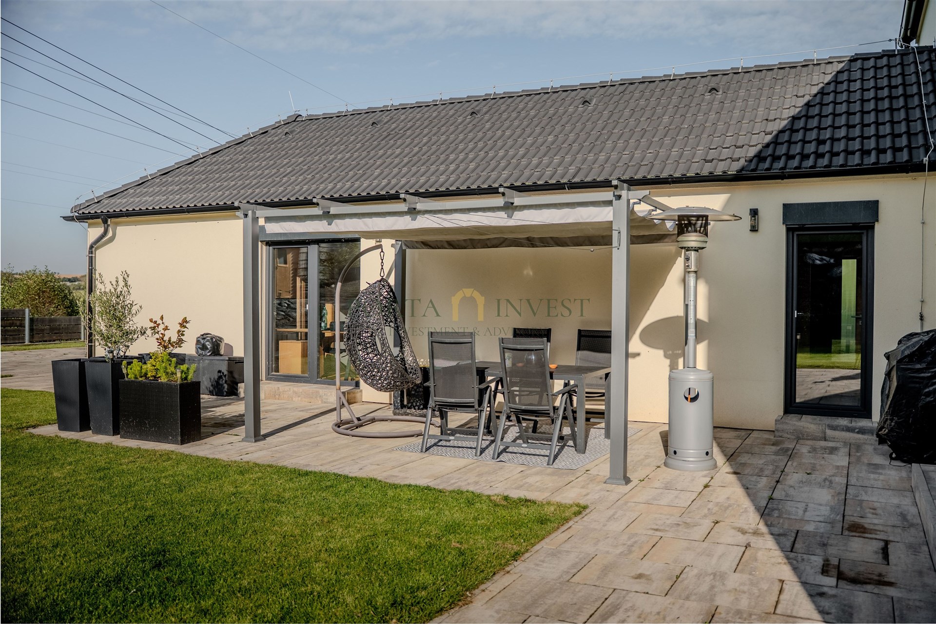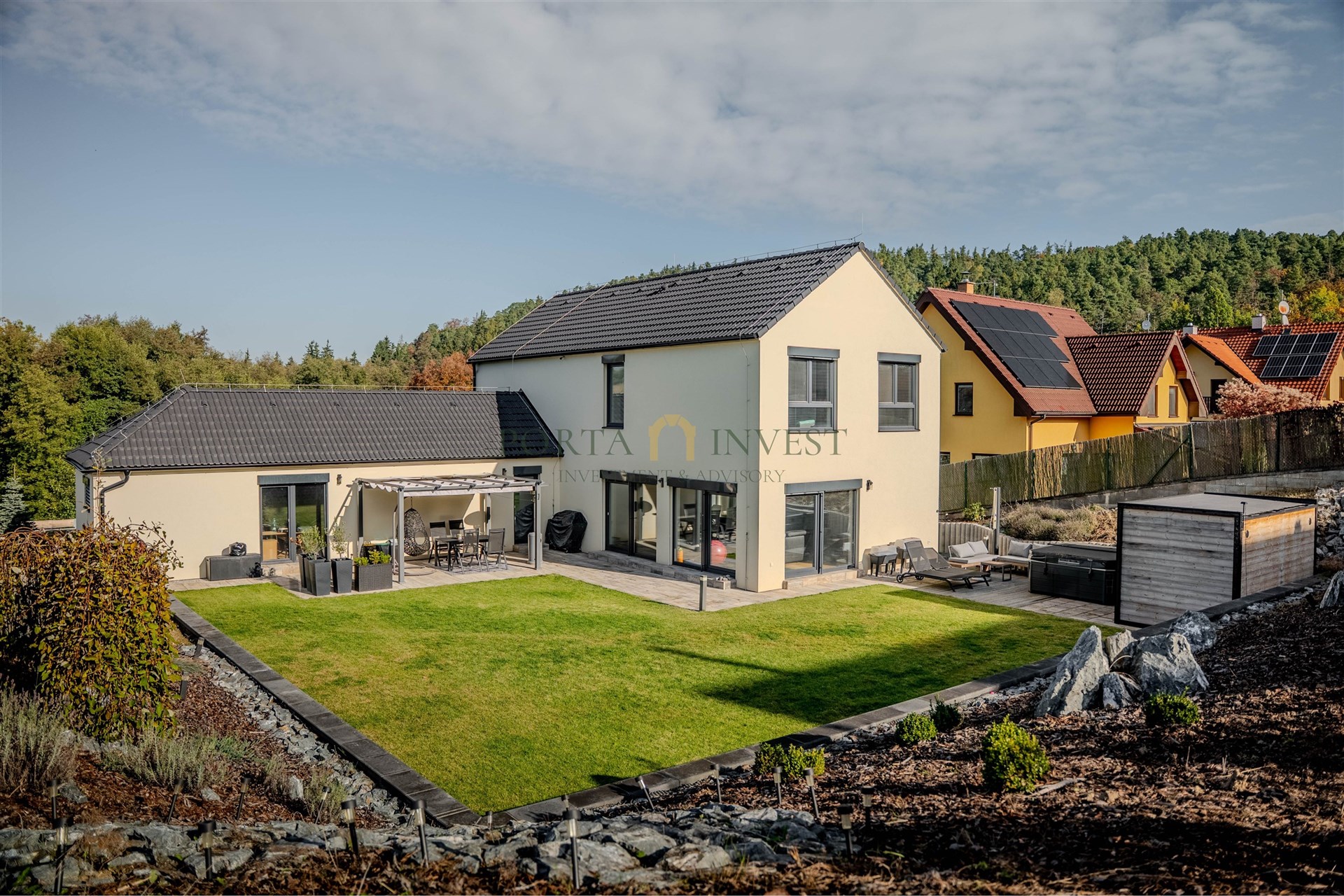 Velmi příjemné klima v celém domě vytváří hliníková okna s trojskly a elektrickými předokenními roletami, dřevěná plovoucí podlaha a stylová dlažba. Do každé obytné místnosti je rozveden internet. Dům je vytápěn efektivním elektrickým podlahovým topením se samostatnou regulací jednotlivých místností, v obývacím pokoji je provedena příprava pro instalaci krbu. Na terase domu (kam lze vstoupit z každé přízemní obytné místnosti) se nachází jak zastíněná pergola, tak i další relaxační prostor s venkovní saunou, vířivkou a sprchou. Zahrada je zde především k odpočinku (automatické sekání trávníku, závlaha). K dispozici je zahradní domek na nářadí a techniku, vkusně upravené kamenné svahy jsou osázeny zelení. Přímo na pozemku se nachází dvě parkovací stání, další stání je na vlastním neuzavřeném pozemku přímo před domem. Celý dům je zabezpečen kamerovým systémem.