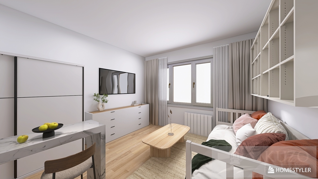 Byt je světlý díky velkému oknu, které je vybaveno elektronickou venkovní roletou, a nabízí praktickou dispozici umožňující oddělení obytné a kuchyňské části. Nachází se v udržovaném domě se dvěma vstupy, což zvyšuje komfort a dostupnost.