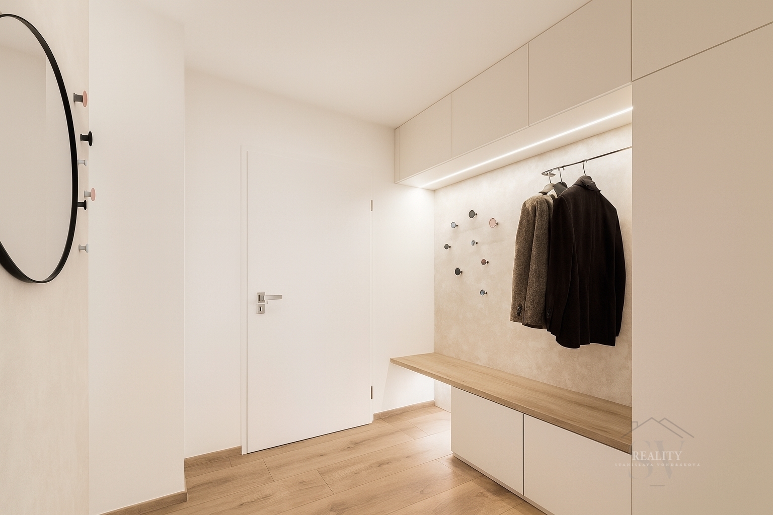 Dispozice bytu je řešena velmi prakticky a byla v rámci rekonstrukce částečně upravena tak, aby nabídla vyšší komfort a lepší využití prostoru.Ze vstupní haly se vchází do prostorného obývacího pokoje s velkým balkonovým oknem, který tvoří centrální část bytu. Na něj navazuje moderní kuchyně s jídelním koutem, oddělená praktickým ostrůvkem. Ten je sladěn s kuchyňskou linkou, poskytuje další úložný prostor a díky přímému osvětlení zároveň opticky rozděluje obývací a kuchyňskou část.