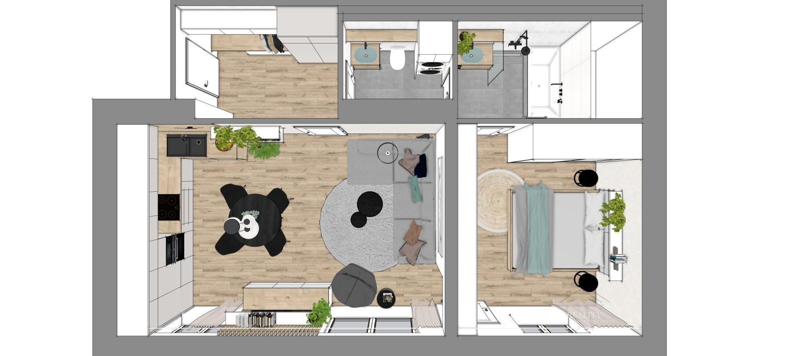 Celý interiér je sladěn do svěžích, moderních tónů, které působí útulně a harmonicky. K bytu je k dispozici kompletní vizualizace a půdorys, které vám umožní lépe si představit budoucí podobu prostoru před dokončením rekonstrukce.