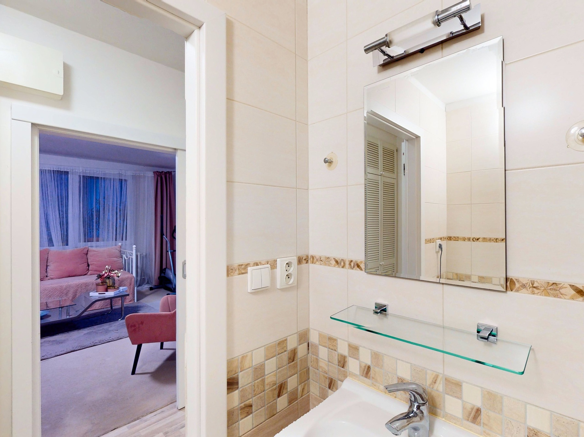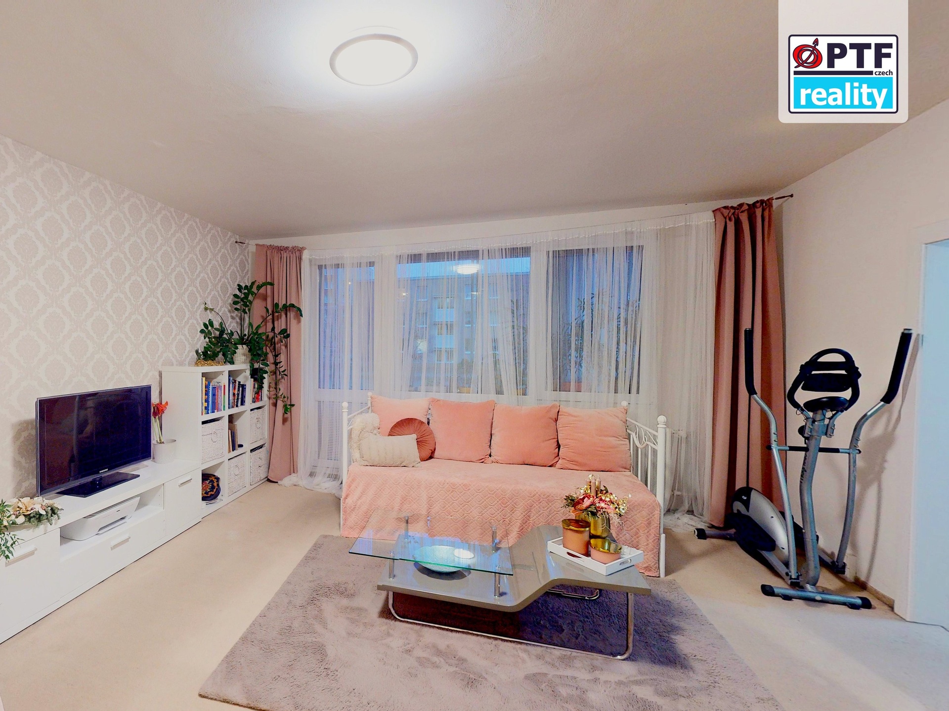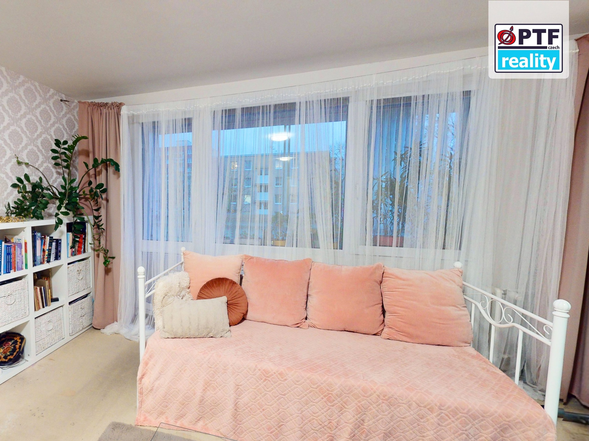 Dominantou bytu je velký čtvercový obývací pokoj s přímým výstupem na prostornou lodžii přes 5 m² — v letních měsících plnohodnotný venkovní pokoj pro posezení, čtení nebo ranní kávu. Výhled z lodžie směřuje do klidné části okolí bez rušné dopravy.