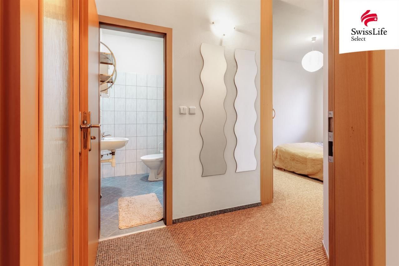 Na první pohled Vám zaujme nadstandardně prostorný obývací pokoj s kuchyňským koutem o výměře 34,8 m - srdce domova, kde je místo pro celou rodinu. Další velkou předností tohoto bytu jsou dvě koupelny. Ta hlavní slouží celé domácnosti a je vybavená vanou, zatímco druhá se sprchovým koutem je přístupná přímo z ložnice a nabízí majitelům klid a soukromý prostor jen pro sebe. Kromě ložnice je zde také další pokoj a prostorná předsíň, která je stejně jako ložnice vybavená vestavěnou skříní. Byt zůstane vybavený lednicí, kuchyňským stolem se židlemi, šatní skříní v pokoji, skříňkami v obýváku, botníkem a konferenčním stolkem.