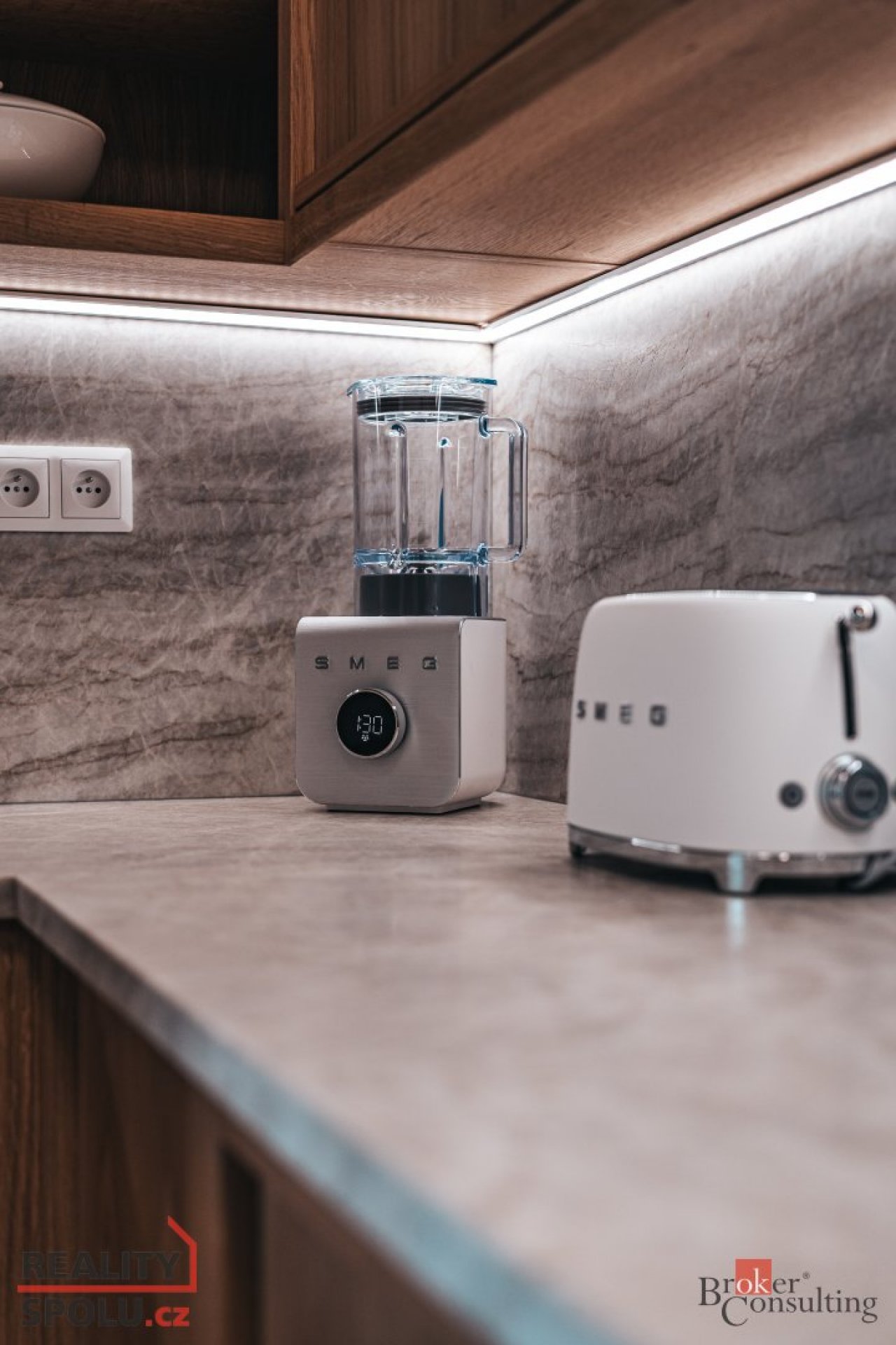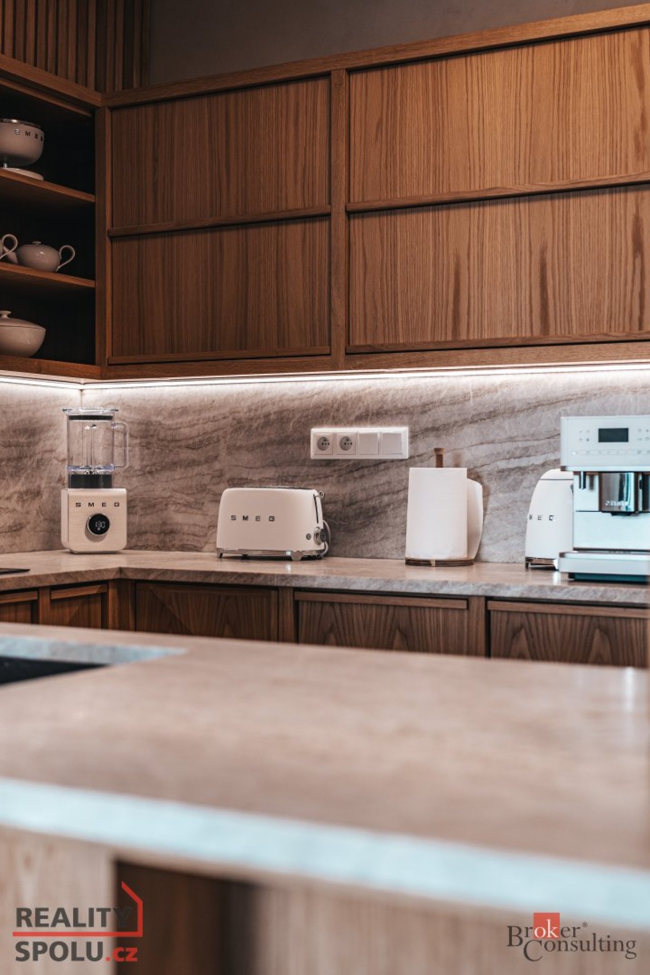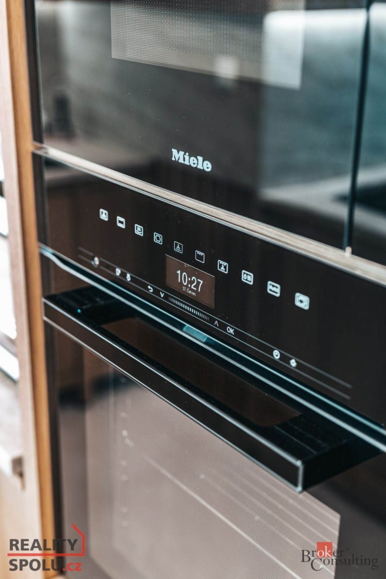Byt je nabízen kompletně vybavený – stačí přijít s osobními věcmi a můžete začít nový život. Vybavení zahrnuje nábytek na míru z dubového masivu a špičkové spotřebiče značky Miele. O příjemné klima a zároveň záložní vytápění se stará klimatizační systém Siemens. Všechny použité materiály i řešení interiéru byly vybírány s důrazem na estetiku, funkčnost, nadčasovost a především kvalitu. Obklady a dlažby pocházejí od italského výrobce Mirage (série Royal), kuchyňské baterie s dřezem a filtrem na vodu dodala renomovaná značka Hansgrohe, osvětlení je z Itálie – Axolight Muse, pracovní kamenná deska Tachmahad a drobné spotřebiče značky Smeg. Zde opravdu není co vytknout.