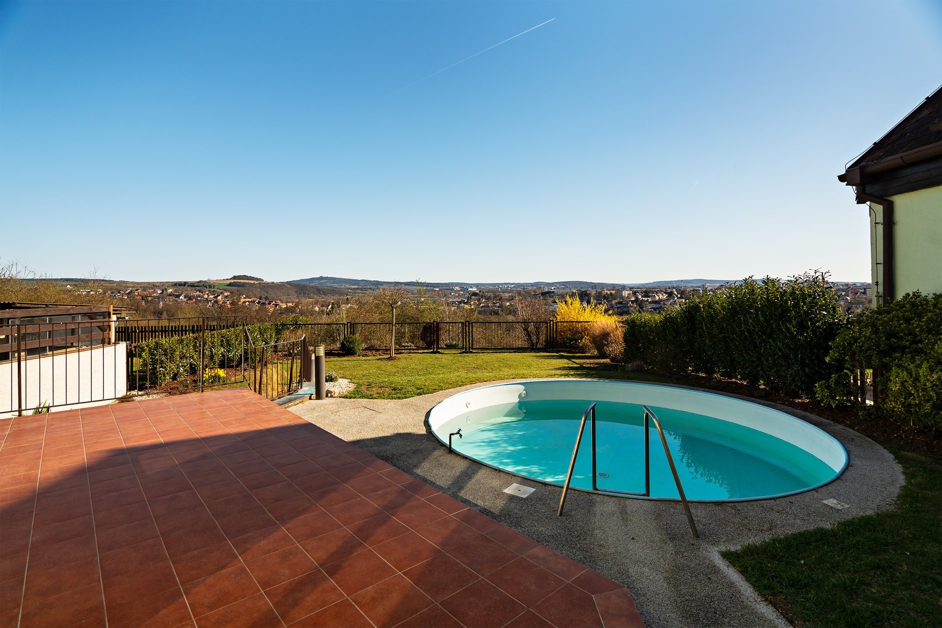 - krásná udržovaná zahrada domu s bazénem terasu směřovanou na jižní stranu