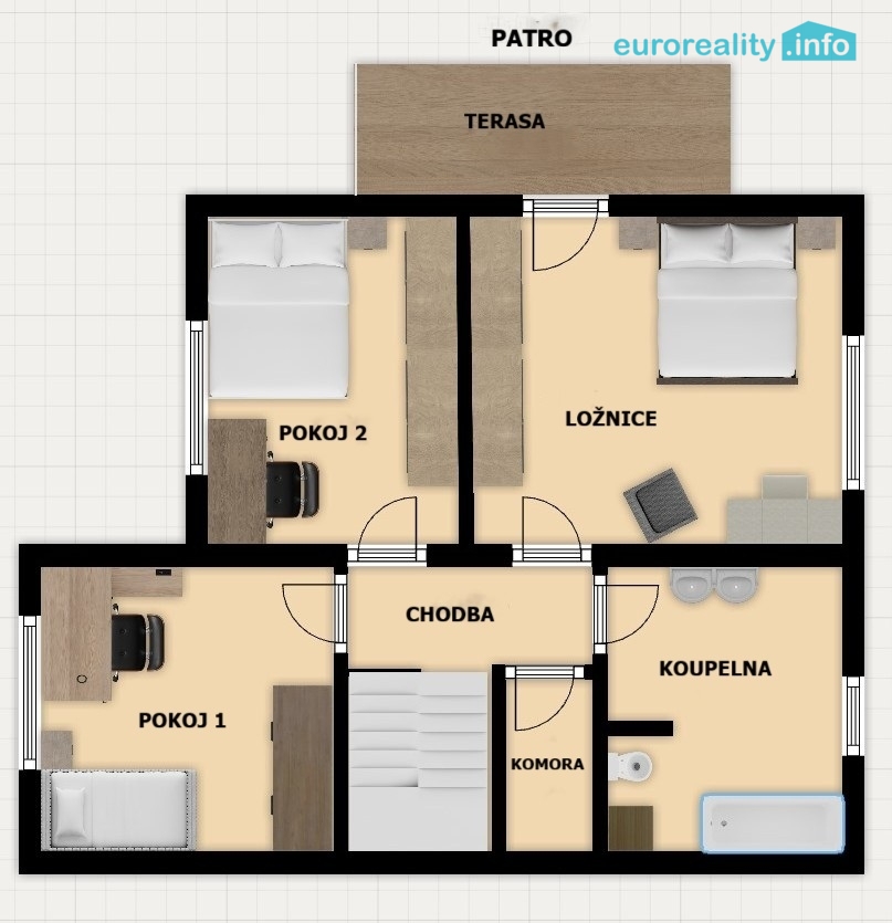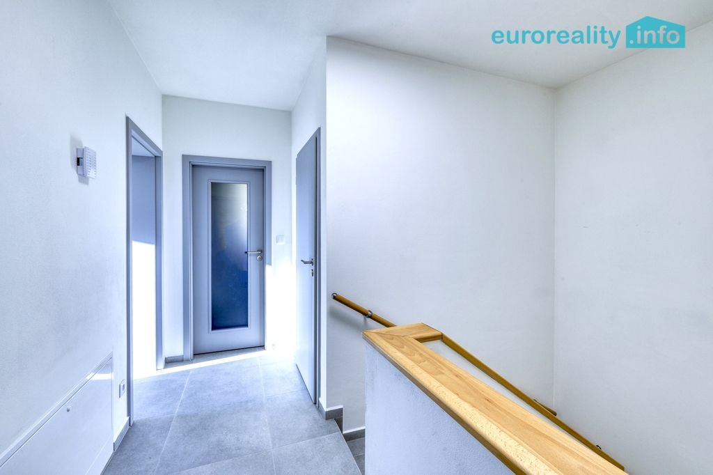 V patře jsou umístěny ložnice a další pokoje, koupelna s toaletou a vstup na horní terasu o ploše cca 18 m², která nabízí příjemný prostor pro relaxaci.