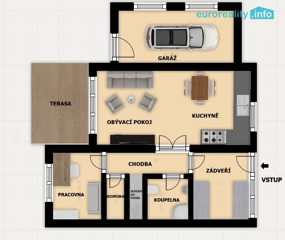V přízemí se nachází prostorný obývací pokoj s kuchyňským koutem a přímým vstupem na terasu a zahradu, dále vstupní hala, technická místnost, spíž a samostatná toaleta. V obývacím pokoji je připraven komín s přívodem čerstvého vzduchu pro instalaci krbových kamen.