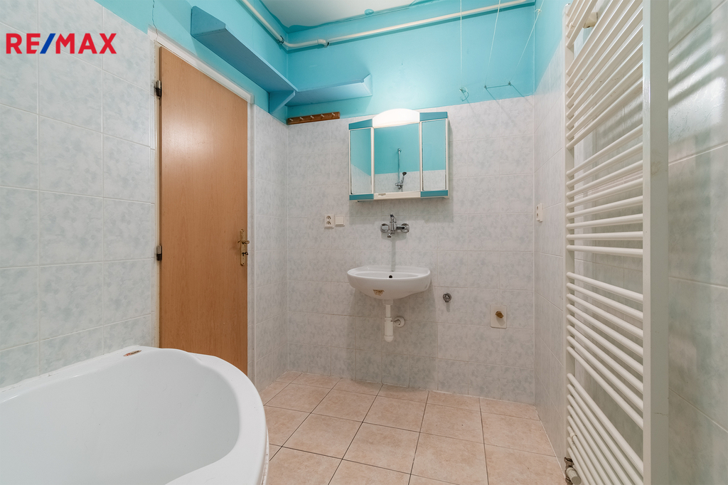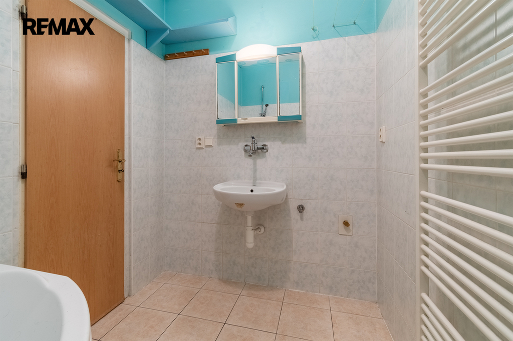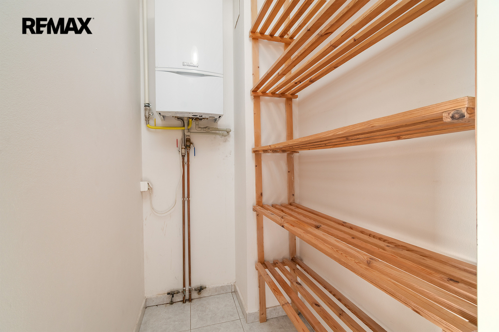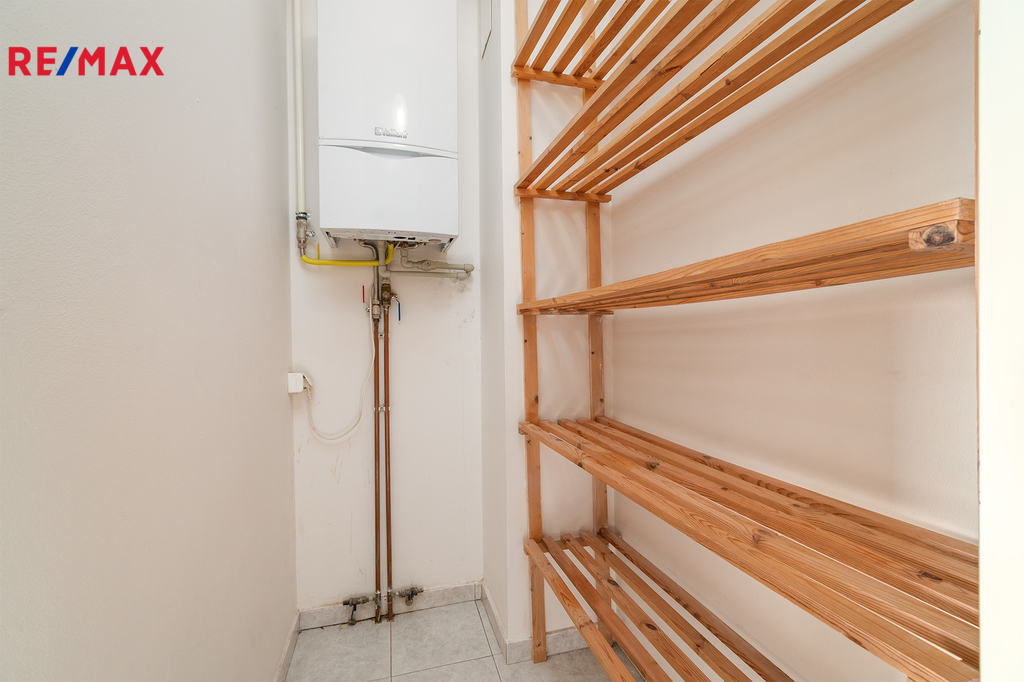 Vytápění bytu i ohřev vody zajišťuje plynový kotel, umístěný v komoře.