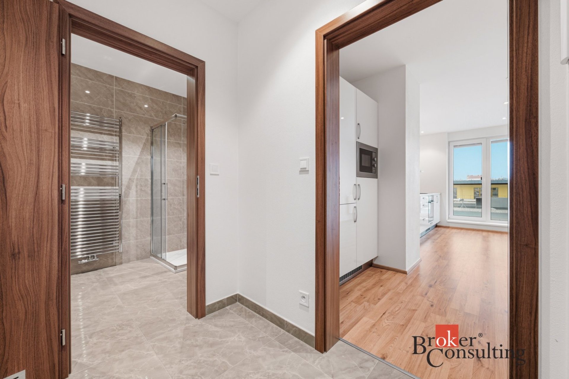 Vstupní chodba poskytuje dostatek místa pro šatní skříň. Koupelna je vybavena sprchovým koutem, toaletou a úložným prostorem pod umyvadlem. Kuchyňská linka je vyrobena na míru a je plně vybavena spotřebiči – nechybí vestavěná lednice s mrazákem, myčka ani mikrovlnná trouba. Na kuchyň navazuje hlavní obytný pokoj, který si lze zařídit podle vlastních potřeb.