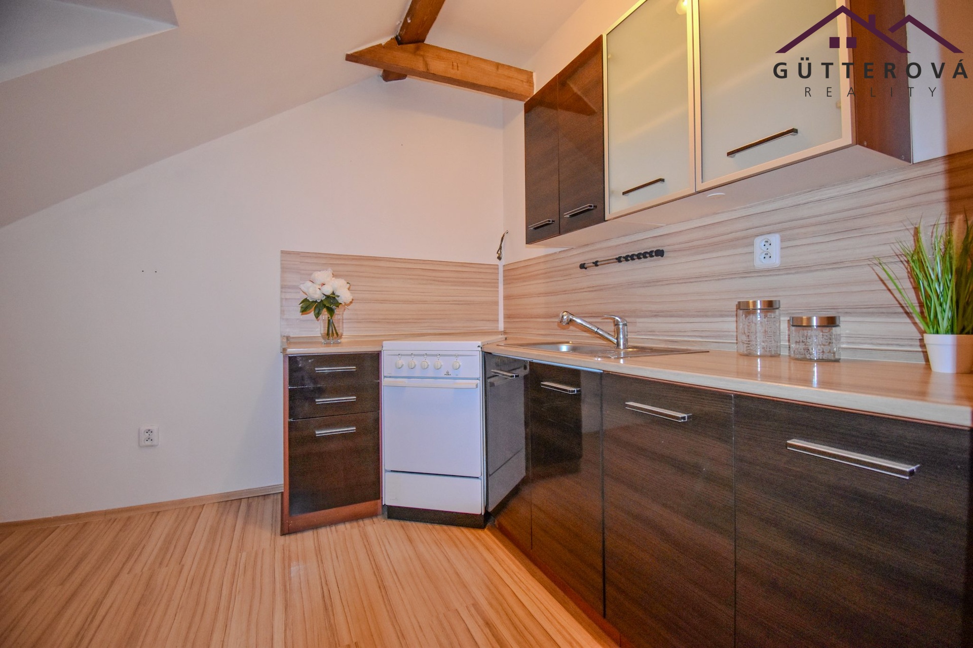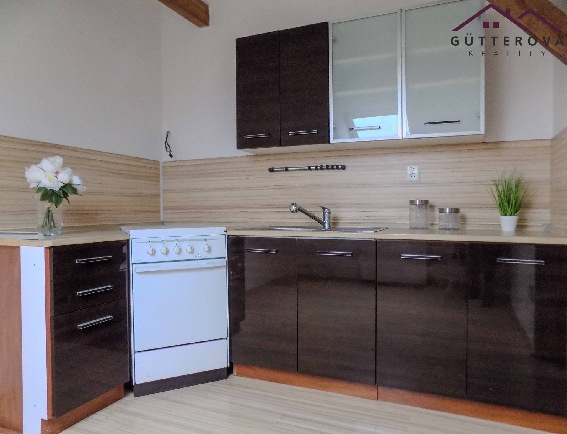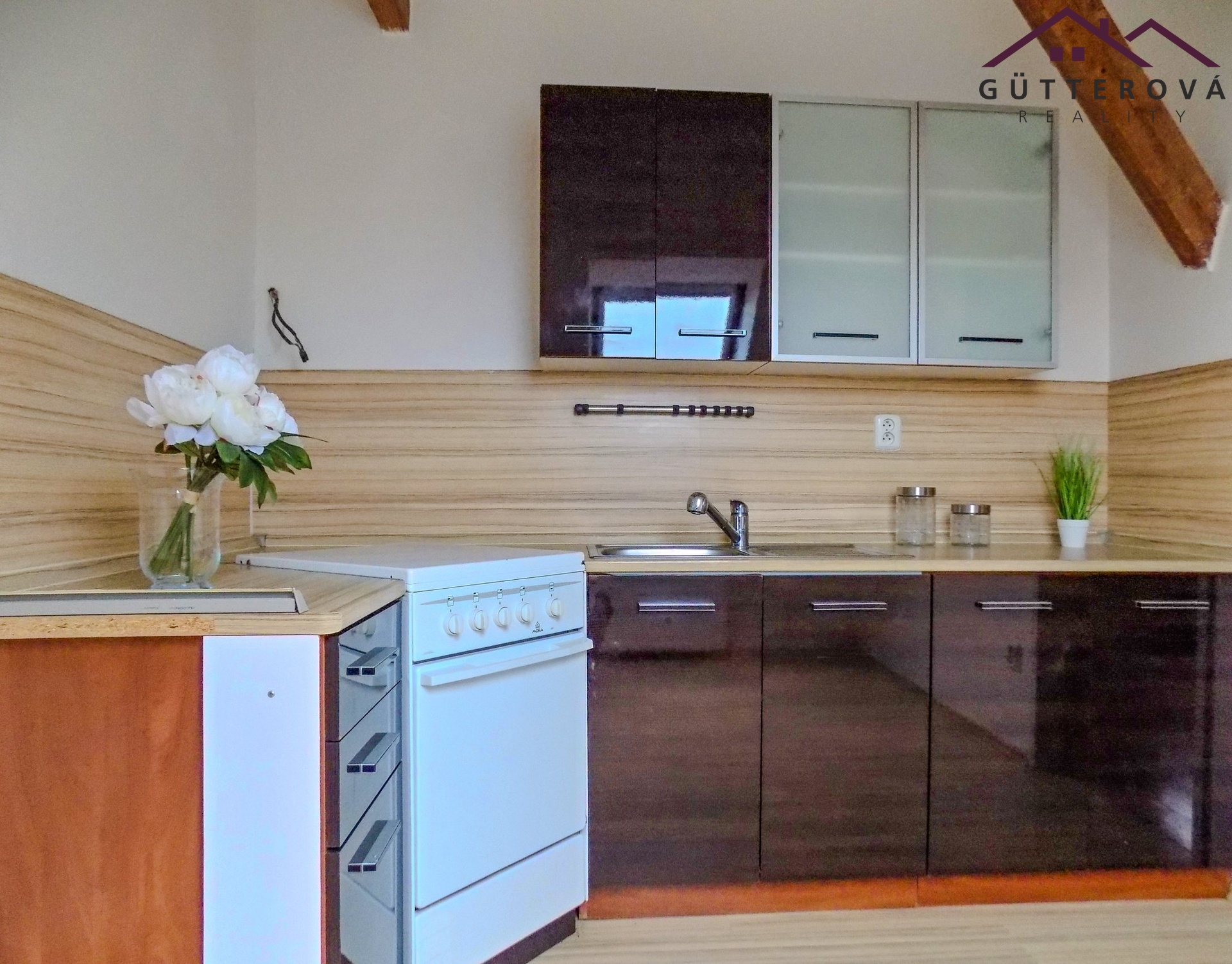 Podkrovní byt se nachází v 5. nadzemním podlaží zděného bytového domu s výtahem a tvoří ho chodba, koupelna s vanou a WC, pokoj a kuchyně vybavena kuchyňskou linkou, plynovým sporákem.