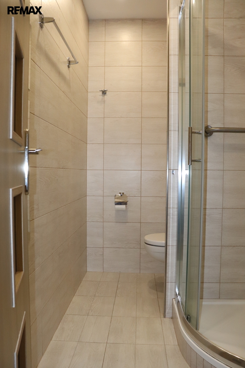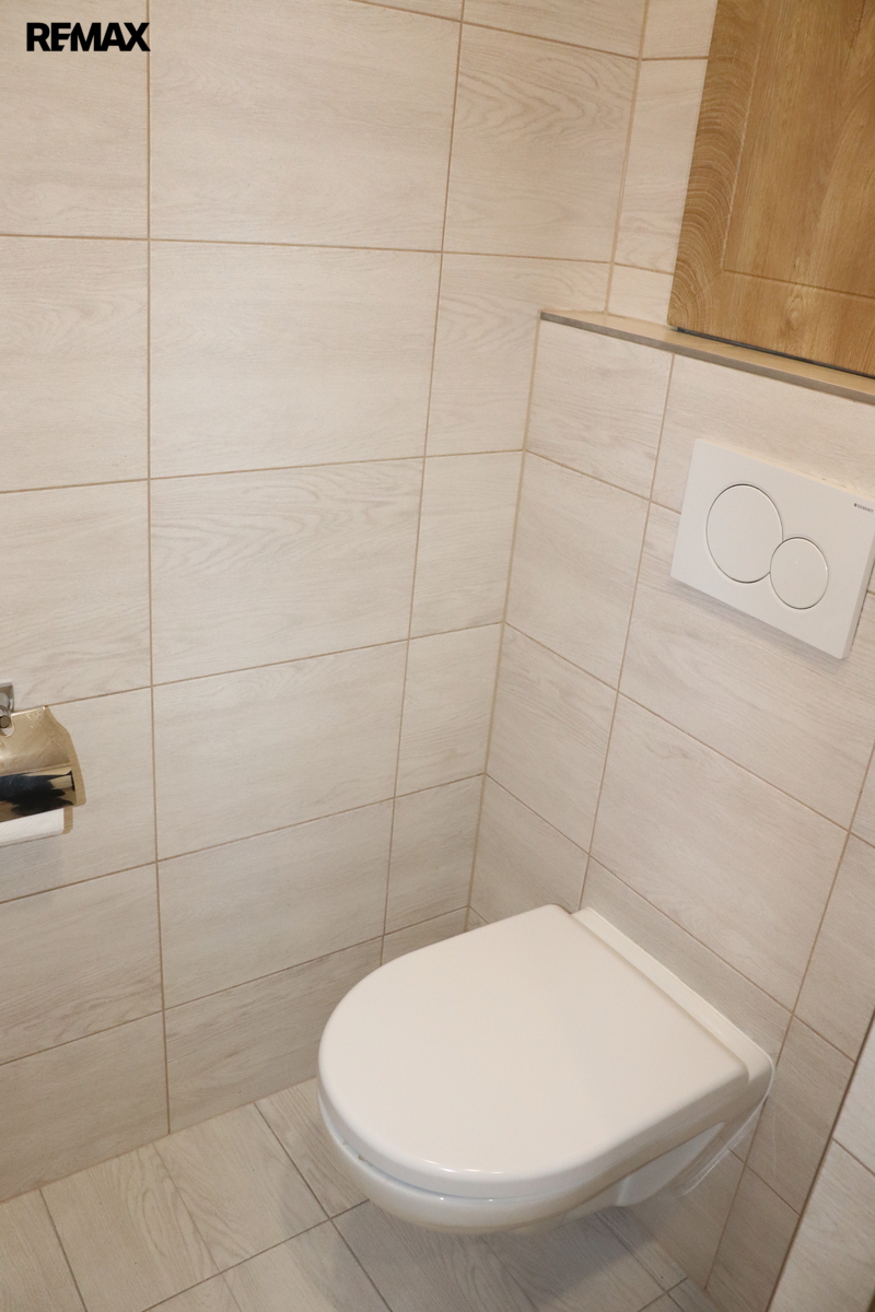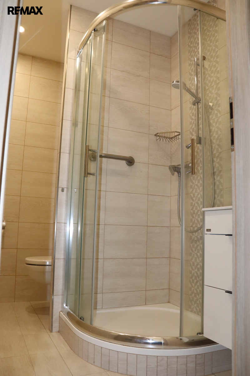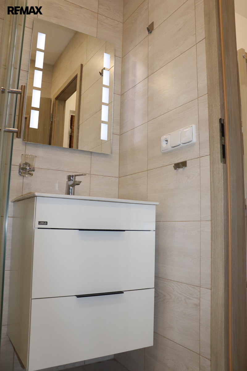 • Koupelna: Zděné jádro v nadčasovém designu se sprchovým koutem, toaletou a umyvadlovou skříňkou.