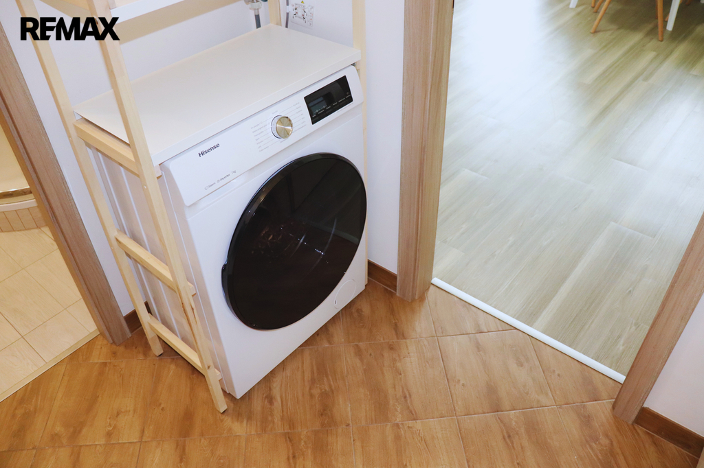 • Předsíň: Další úložné prostory v podobě zrcadlové skříně a pračka značky Hisense.