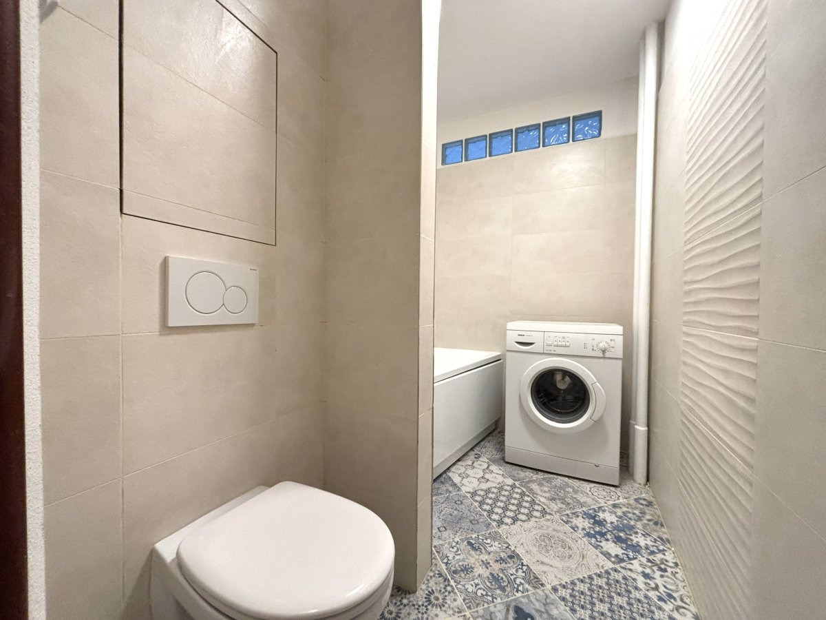 Koupelna je zařízena vanou, umyvadlem a zrcadlem s osvětlením a pračkou.