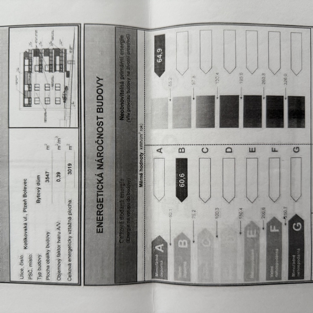 - Ukazatel energetické náročnosti budovy: 64.9 kWh/m²