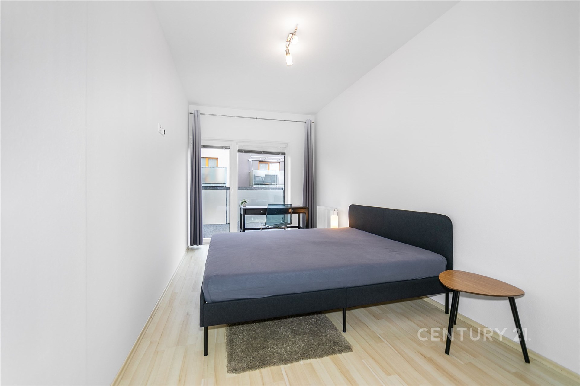 Obývací pokoj je propojen s kuchyňským koutem, který je vybaven myčkou, lednicí, troubou, mikrovlnnou troubou, indukční deskou, rychlovarnou konvicí a veškerým potřebným nádobím. V ložnici nechybí pohodlná postel s nočními stolky a pracovní stůl. Úložné prostory jsou chytře vyřešeny díky velké vestavěné skříni v předsíni. Z ložnice je přímý vstup na balkon, který jistě oceníte zejména v letních měsících.