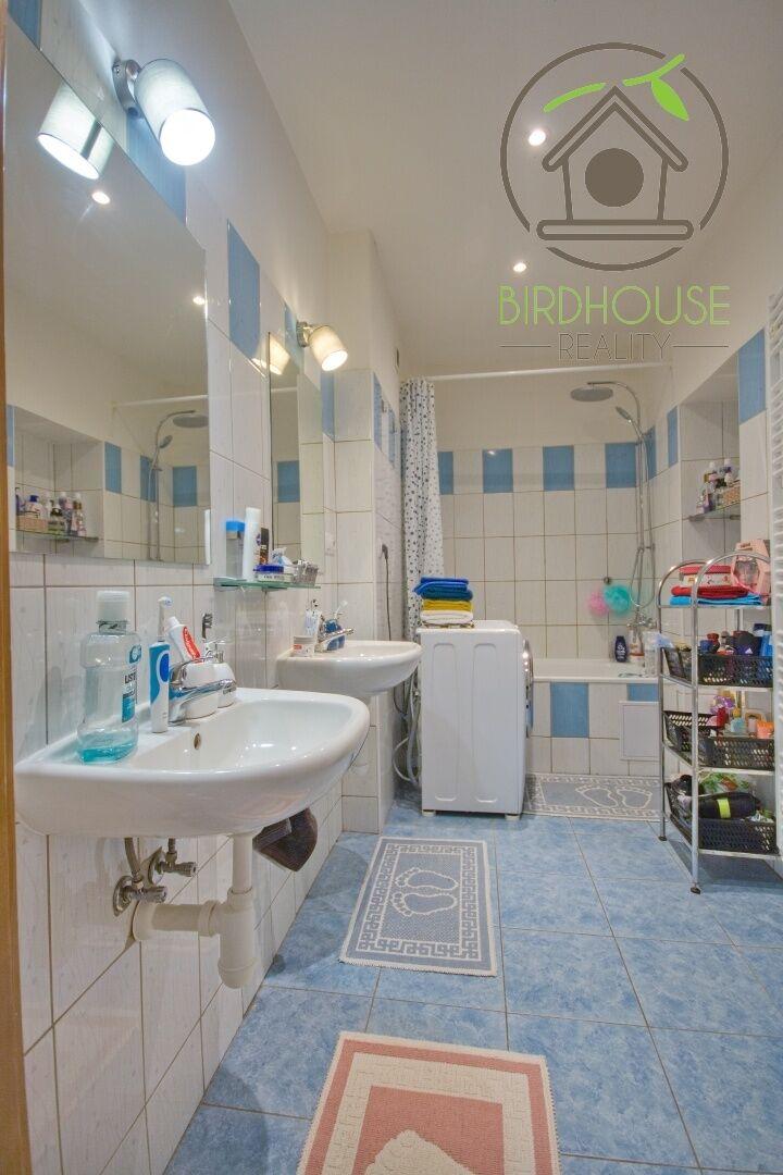 - Koupelna (6,8 m2), která je zařízena vanou se sprchovací hlavicí, díky které si zde přijdou na své i příznivci sprch. Dále zda naleznete dvě umyvadla se zrcadly, žebřinové topení a samozřejmostí je také příprava na instalaci automatické pračky.