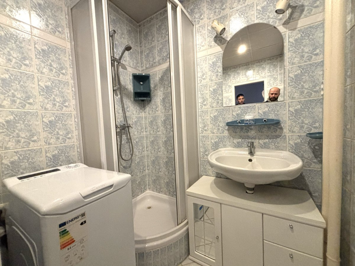 Koupelna je vybavena sprchovým koutem, umyvadlem s umyvadlovou skříňkou s osvětleným zrcadlem a pračkou.