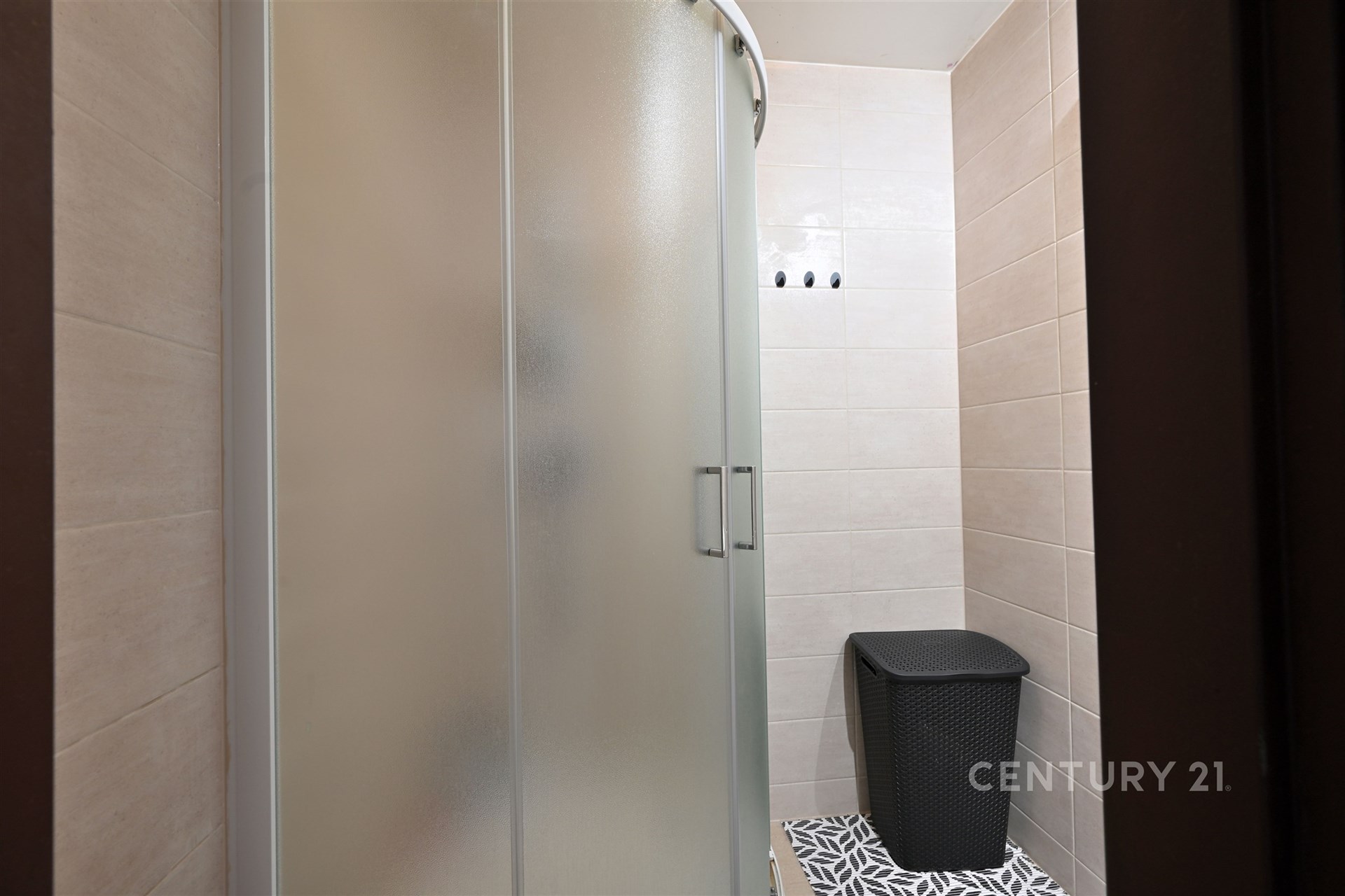 Dominantou bytu je obývací pokoj, kde najdete rozkládací sedačku, konferenční stolek, televizní stolek s TV, police i příjemné osvětlení. Atmosféru prostoru doplňuje akvárium, které dodává místnosti klidnou a pohodovou náladu.