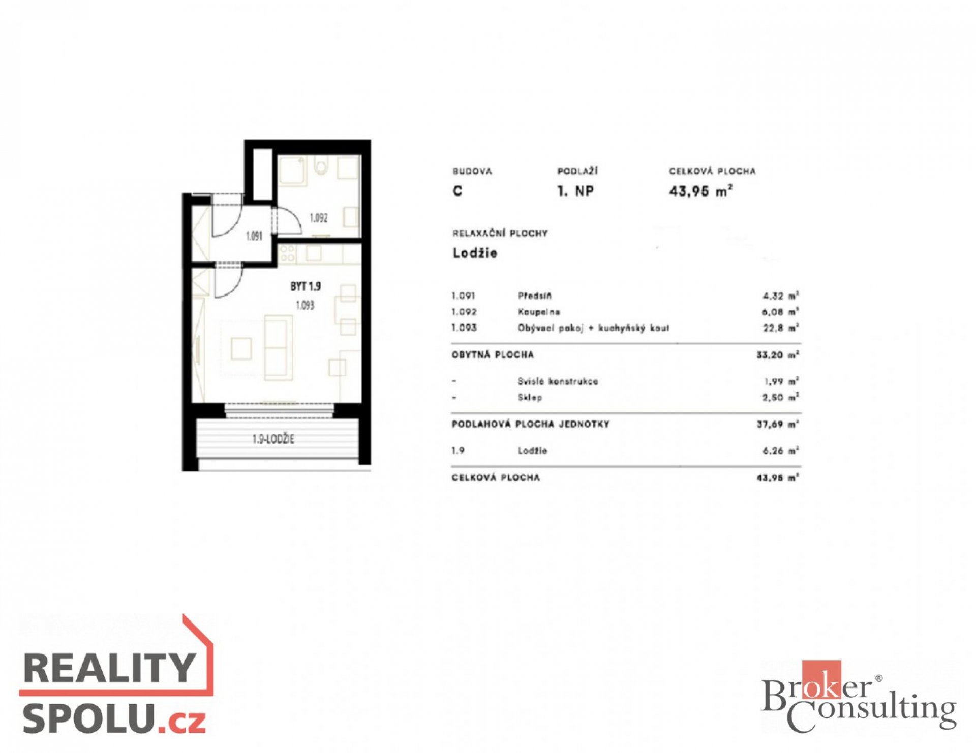 | Dispozice/podlahová plocha: | 1+kk/43.95 m² |