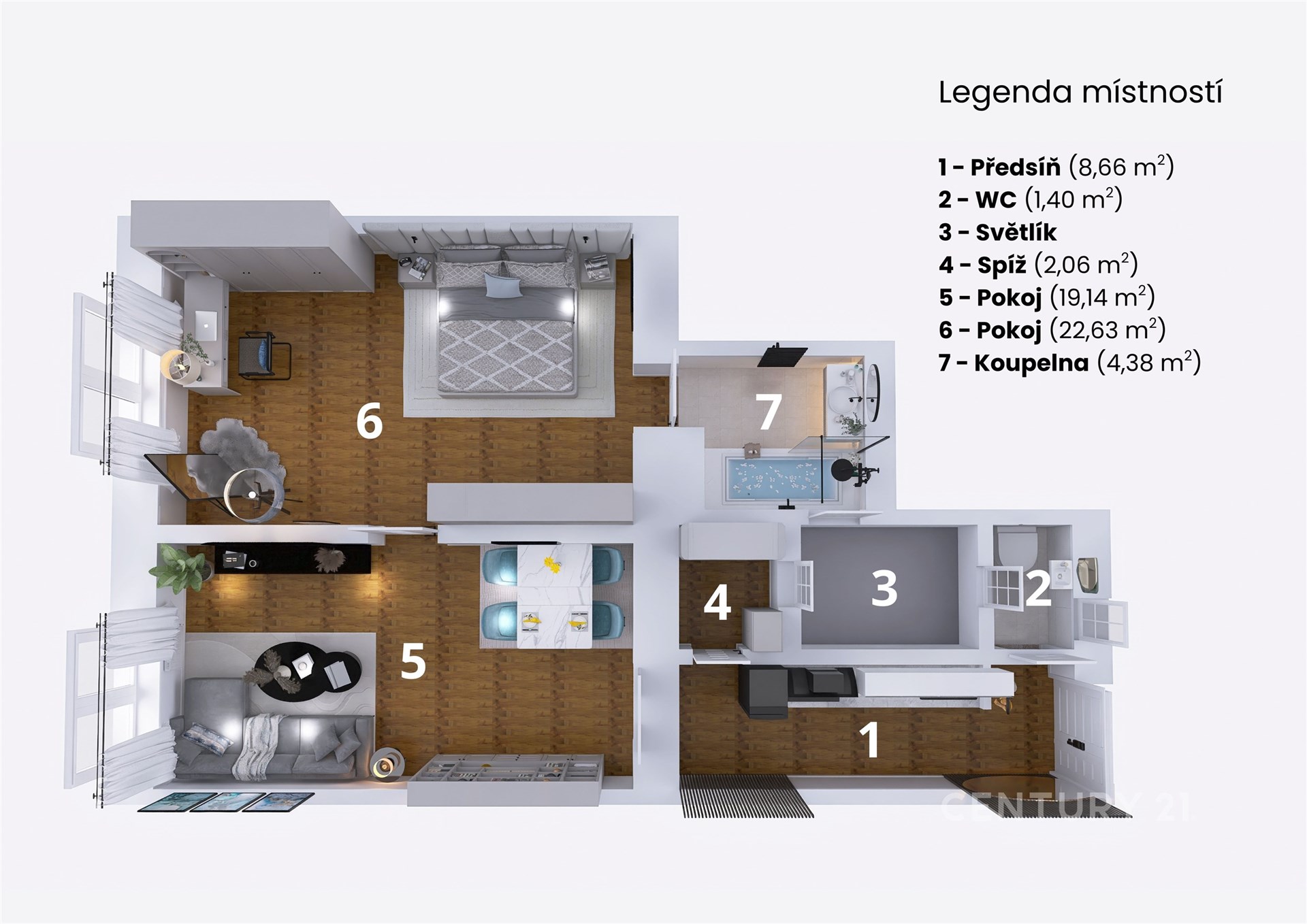 Dispozice zahrnuje dva světlé a prostorné pokoje, praktický kuchyňský kout se spíží, koupelnu a oddělené WC. Interiér působí vzdušně a útulně zároveň – ideální pro jednotlivce i pár.