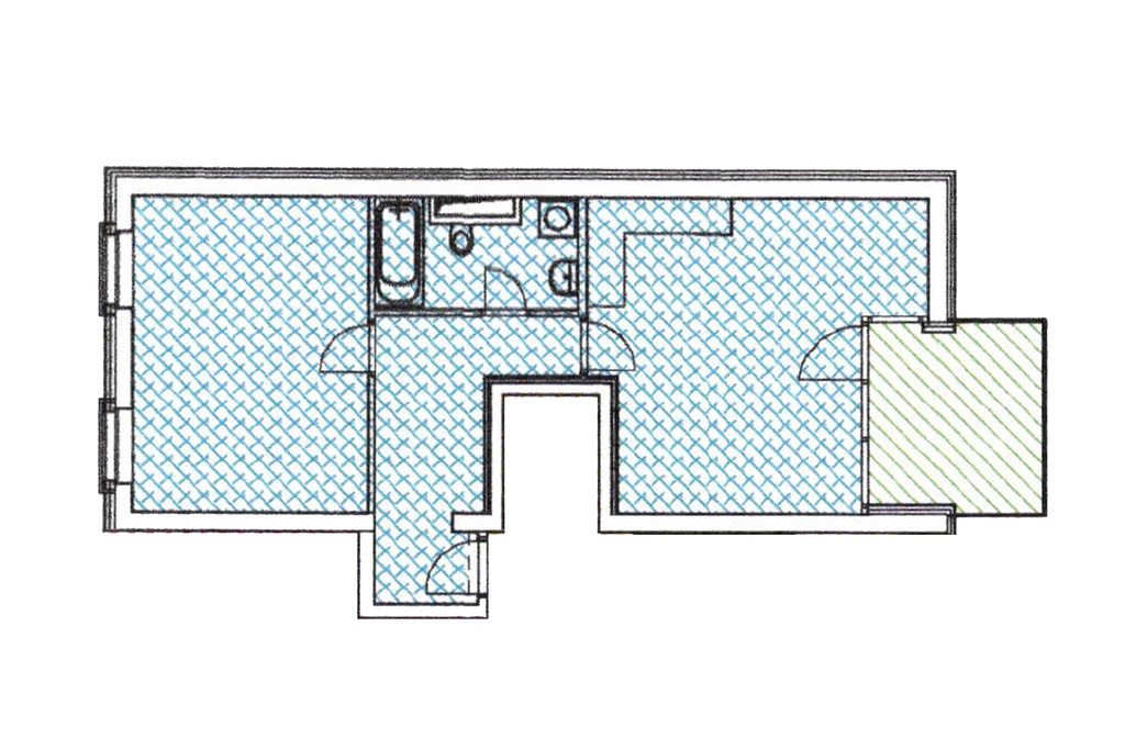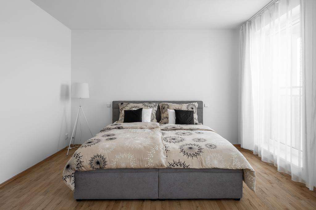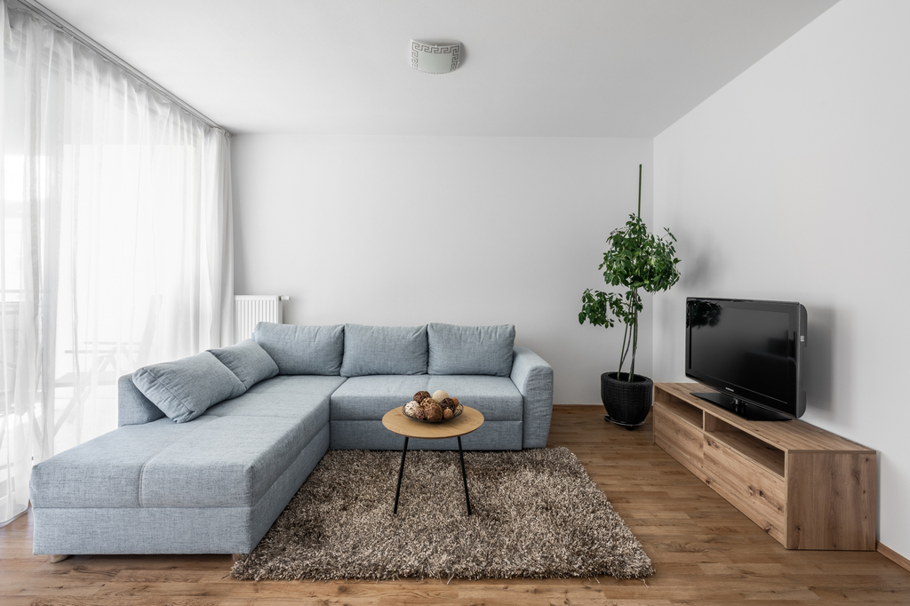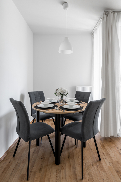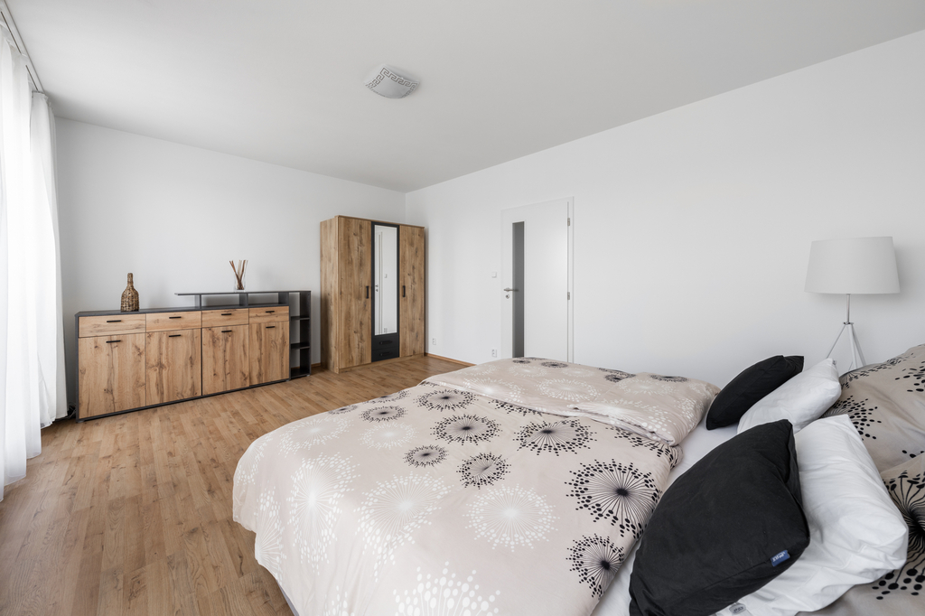 Dispozice bytu je velmi praktická. Z předsíně se samostatně vchází do všech místností, a to do obývacího pokoje s kuchyňským koutem, ložnice a do koupelny s toaletou. Dominantou obývací části je velké francouzské okno, které prostor příjemně prosvětluje a zároveň umožňuje vstup na jižně orientovaný balkon. Ten je vybaven venkovním osvětlením a elektrickou zásuvkou.