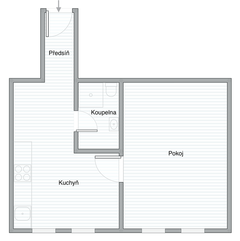 Dispozice zahrnuje pokoj, kuchyň, předsíň a koupelnu s toaletou. Součástí vybavení je kuchyňská linka včetně vestavné elektrické trouby, sklokeramické varné desky, digestoře a dále samostatně stojící lednice s mrazákem. Neschází ani úsporné LED osvětlení celého bytu, dvoudrážková kolejnice pro uchycení záclon a závěsů nad každým oknem, koupelnový nábytek či domácí videotelefon.