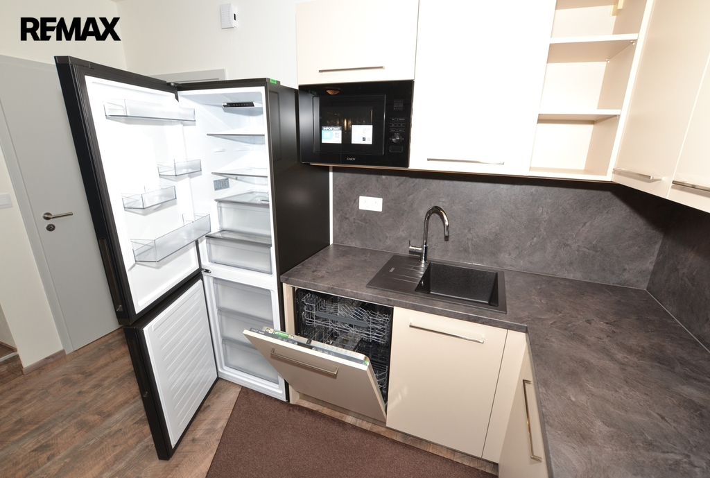 Moderní kuchyňská linka je včetně vestavěných spotřebičů - indukční el. varné desky, multifunkční el. trouby, mikrovlnné trouby, myčky nádobí a k dispozici je lednice s mrazákem.