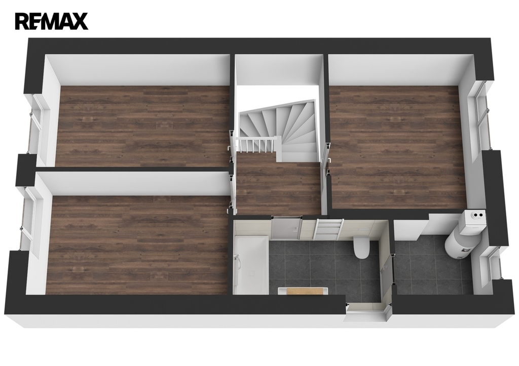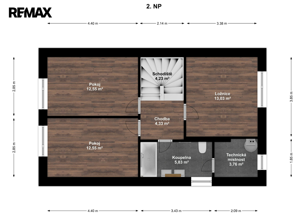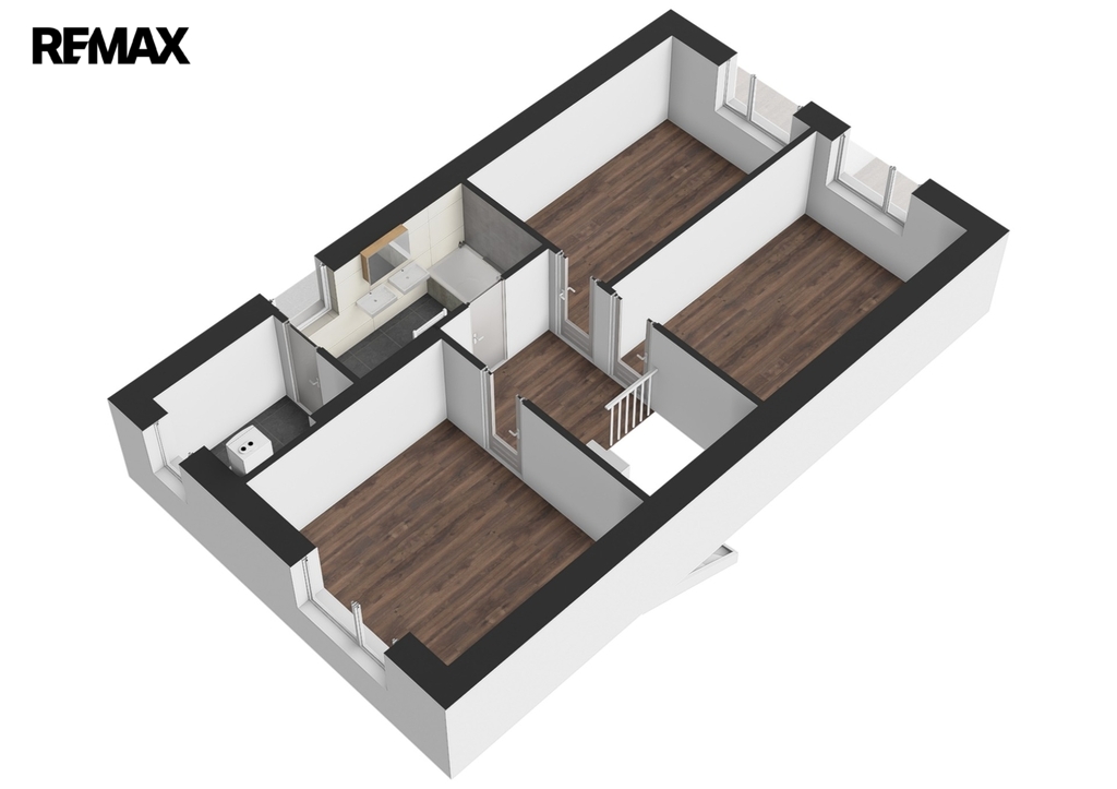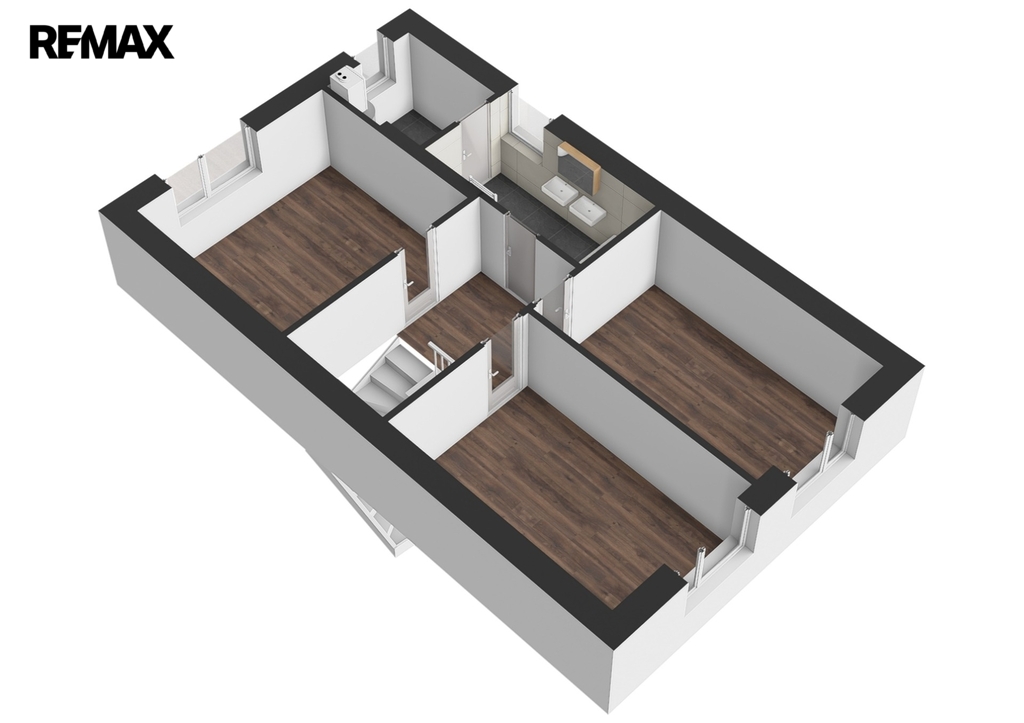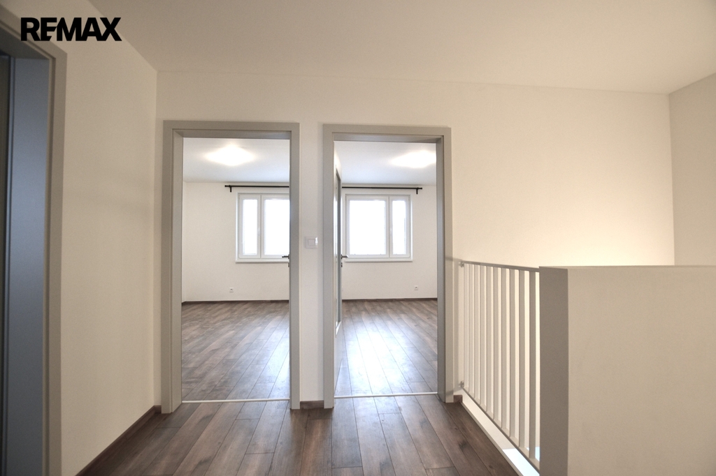 V patře jsou další tři pokoje, vzájemně neprůchozí, každý se vstupem z chodby, dále pak koupelna s vanou, toaletou a dvěma umyvadly. Za koupelnou se nachází místnost s řídící jednotkou a zásobníkem vody tepelného čerpadla pro vytápění a ohřev vody, zde je i možno instalovat pračku se sušičkou prádla.