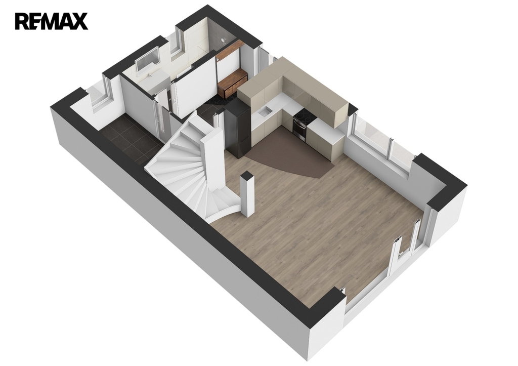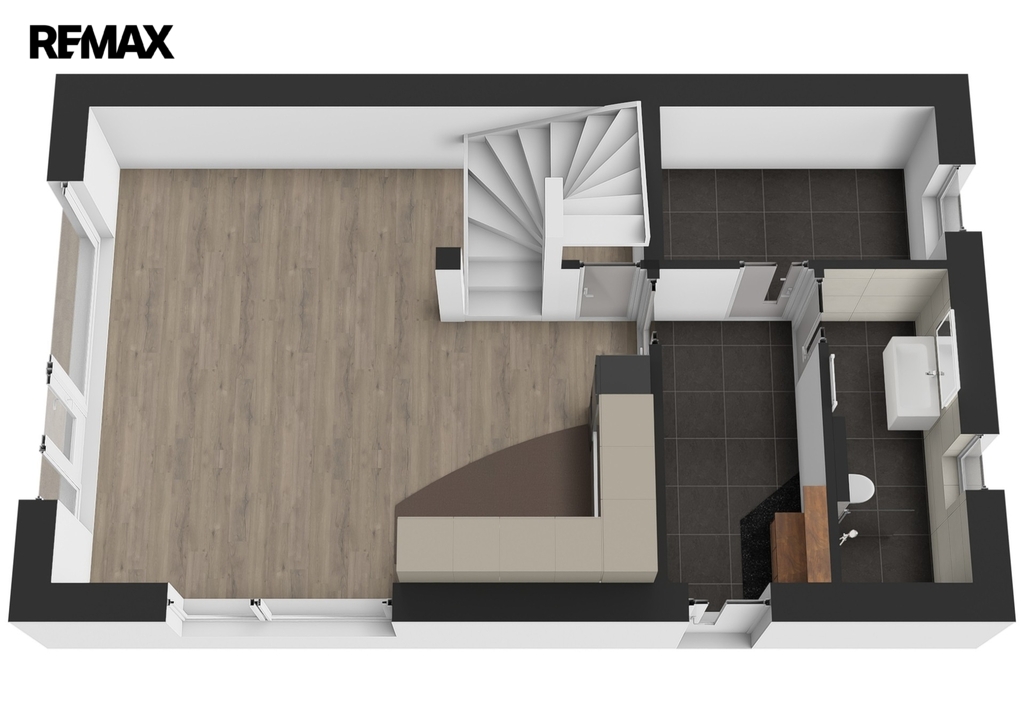 Přízemí domu nabízí prostorný obývací pokoj s kuchyňským koutem a komorou, koupelnu se sprchovým koutem a toaletou, sklad a zádveří. Z obývacího pokoje je vstup na terasu (cca 19 m2) a do zahrady ( cca 305 m2) s orientací na příjemnou slunnou západní stranu.