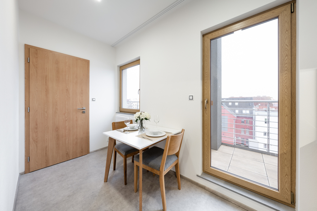 Dispozice zahrnuje pokoj, kuchyň, předsíň a koupelnu s toaletou. Součástí vybavení je kuchyňská linka včetně vestavné elektrické trouby, sklokeramické varné desky, digestoře, dále samostatně stojící lednice s mrazákem, jídelní stůl s židlemi, sedačka, konferenční stolek, komoda, dvě jednolůžkové postele s matracemi, skříňka s policemi, odkládací stolek, lampa, prostorná šatní skříň a pračka. Neschází ani úsporné LED osvětlení celého bytu, dvoudrážková kolejnice pro uchycení záclon a závěsů nad každým oknem, koupelnový nábytek či domácí videotelefon.
