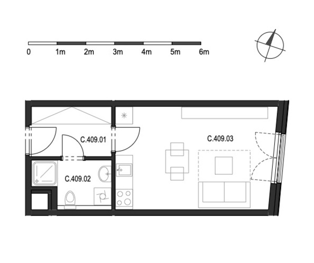 Bytová jednotka je umístěna ve 4. nadzemním podlaží (z celkových 7) energeticky úsporné novostavby (třída B). Středová poloha bytu přispívá nejen k vyššímu tepelnému komfortu, zvláště v zimních měsících, ale také k úspoře nákladů na jeho vytápění. Byt je členěn na pokoj s kuchyňským koutem, předsíň a koupelnu s toaletou.