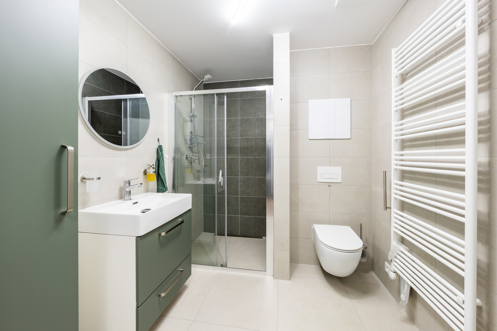 Vytápění a ohřev teplé vody pro celý bytový dům zajišťuje tepelné čerpadlo a fotovoltaické panely. V celém bytě je instalováno podlahové vytápění a v koupelně je navíc topný žebřík. Spotřeba energií je měřena individuálně pro každý byt.