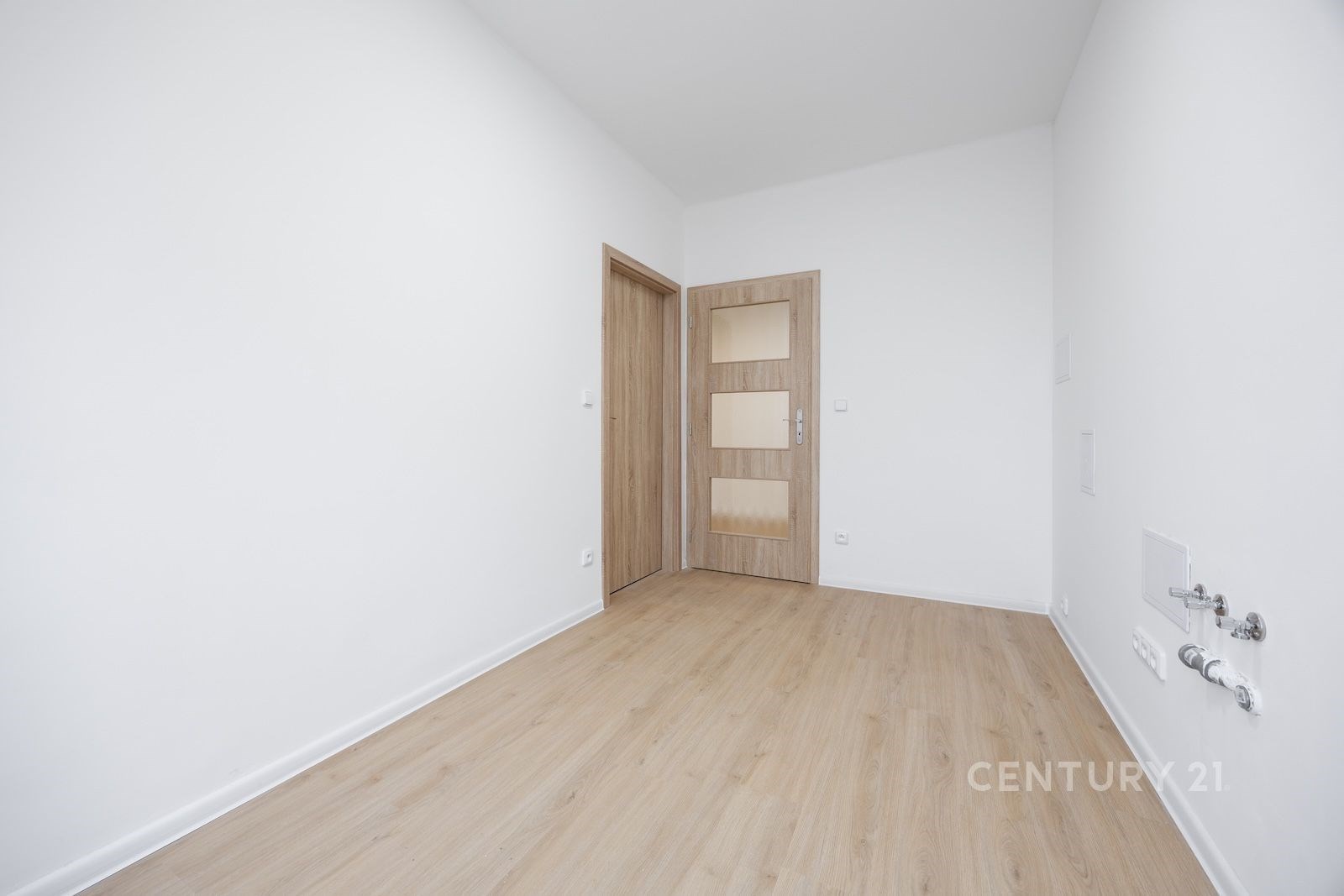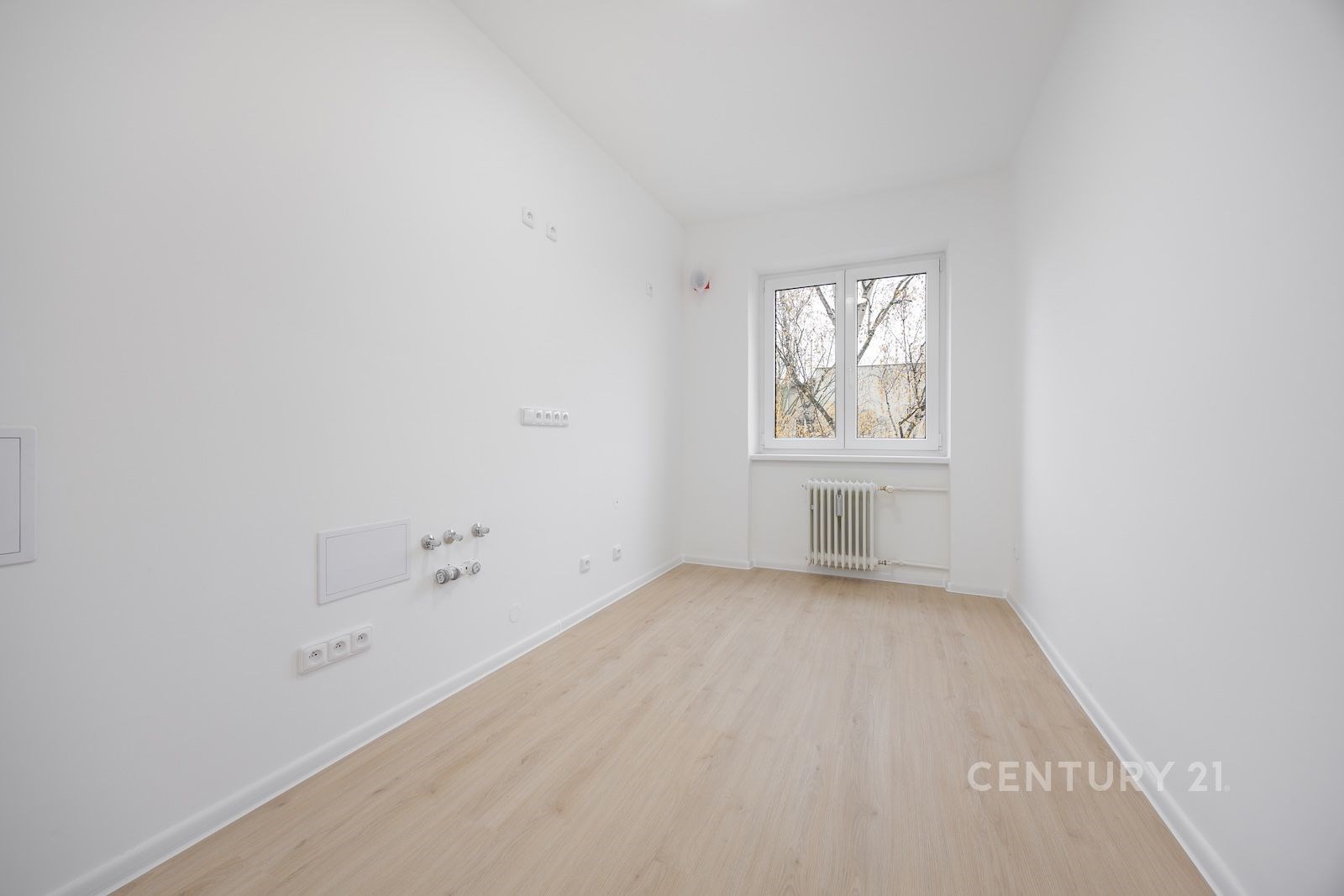 Obývák zdobí francouzské okno – ideální na to, abyste ráno mohli dramaticky roztáhnout závěsy a cítit se jako ve filmu. Kuchyň je připravena k instalaci vlastní linky, takže si můžete splnit sen o kuchyni, ve které budete vařit… nebo si aspoň budete dělat kafe s větším stylem.