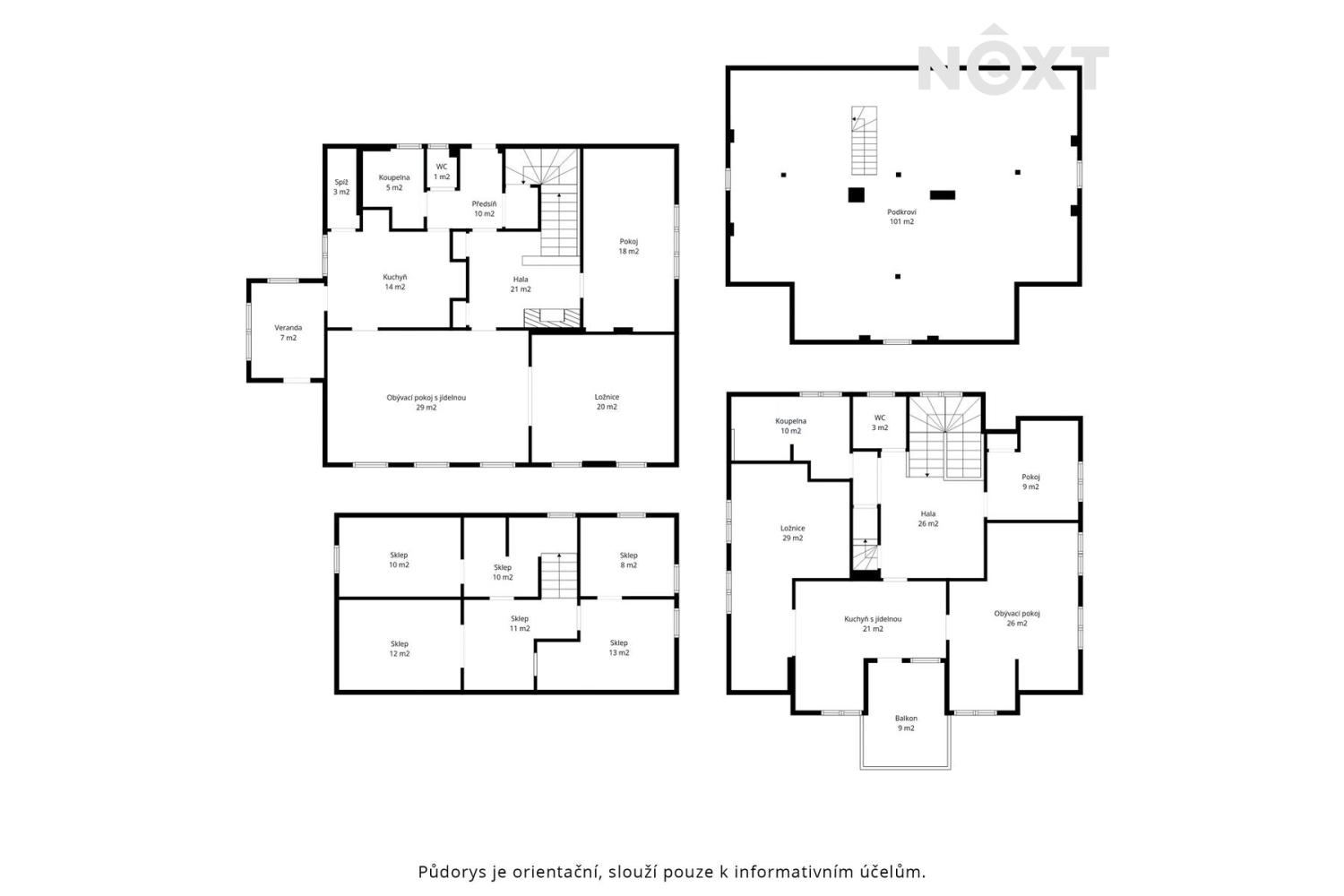Suterén: Pět samostatných místností (sklady/dílny) ideálních pro kutily nebo jako vinný sklípek.