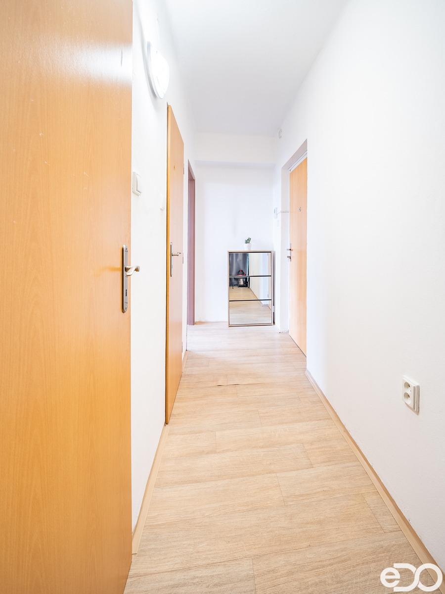 Praktické uspořádání, které dává smysl. Centrální chodba propojuje samostatnou kuchyň s oknem, dva neprůchozí pokoje a koupelnu s odděleným WC. Nechybí ani úložný prostor – ideální pro věci, které potřebují své místo mimo obývací zónu. Součástí nabídky je sklep.