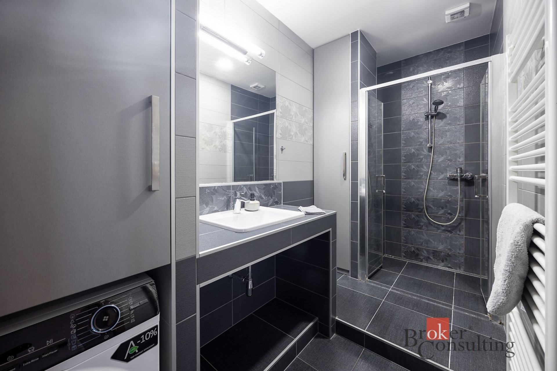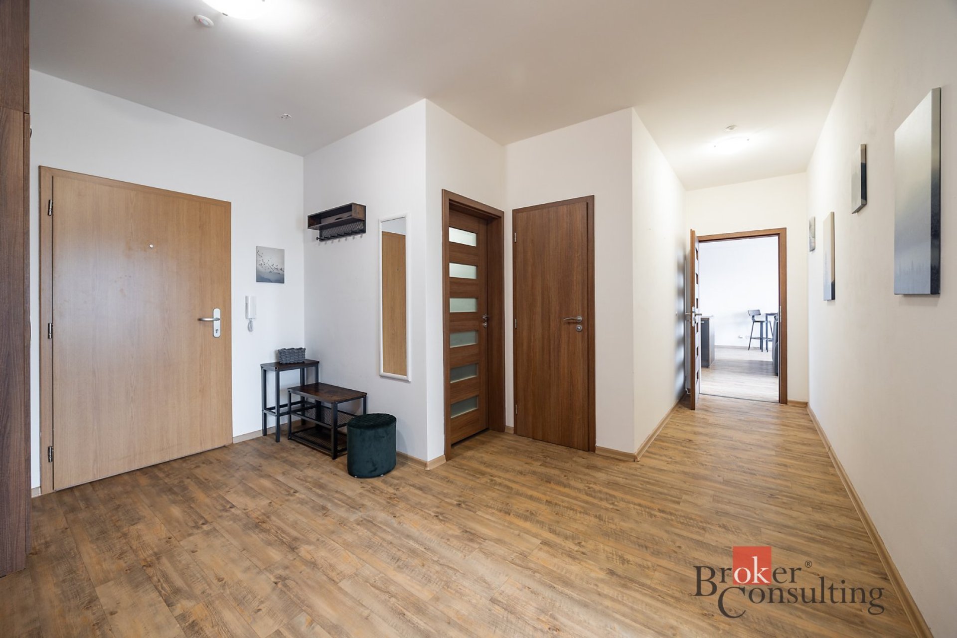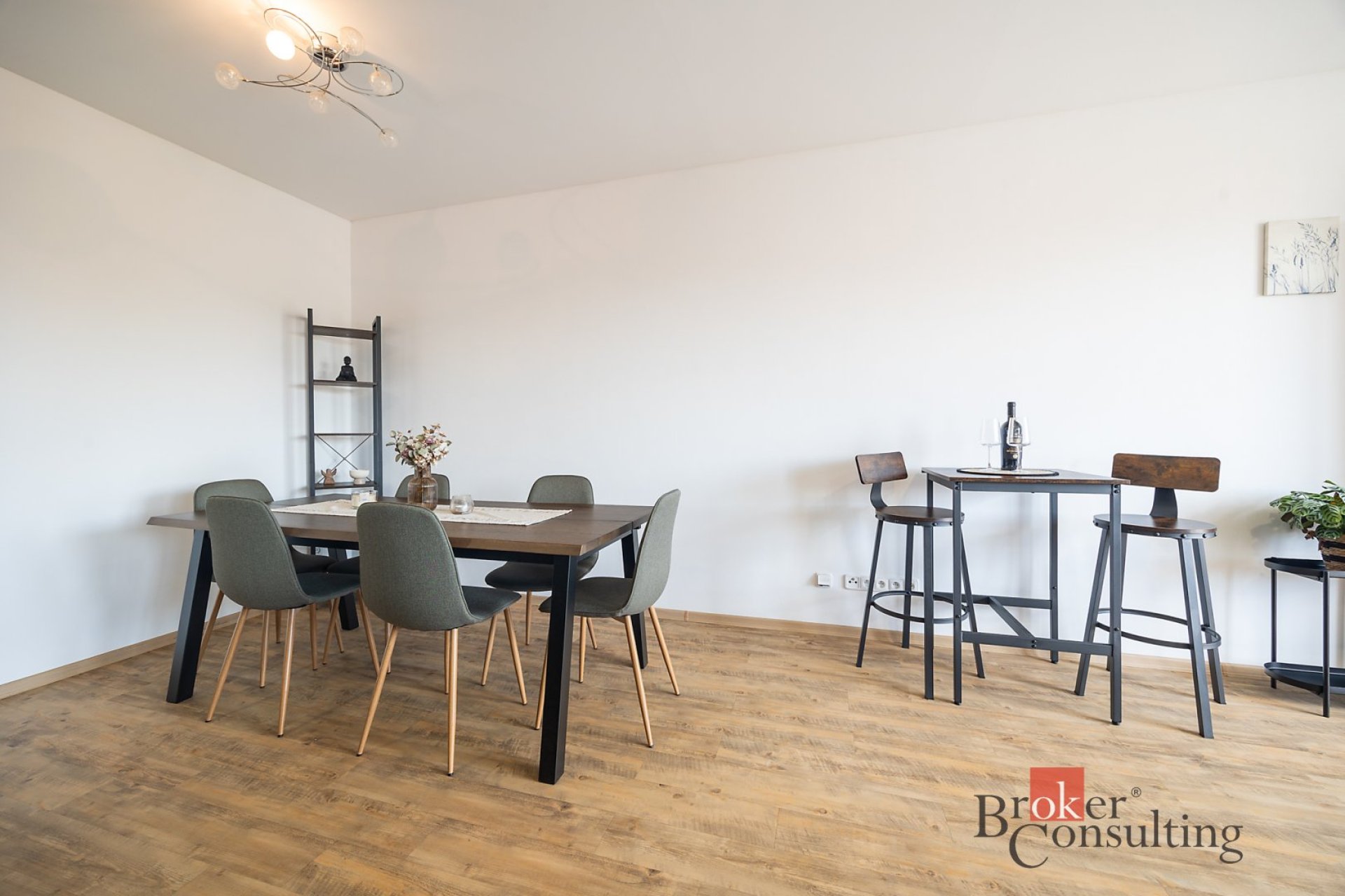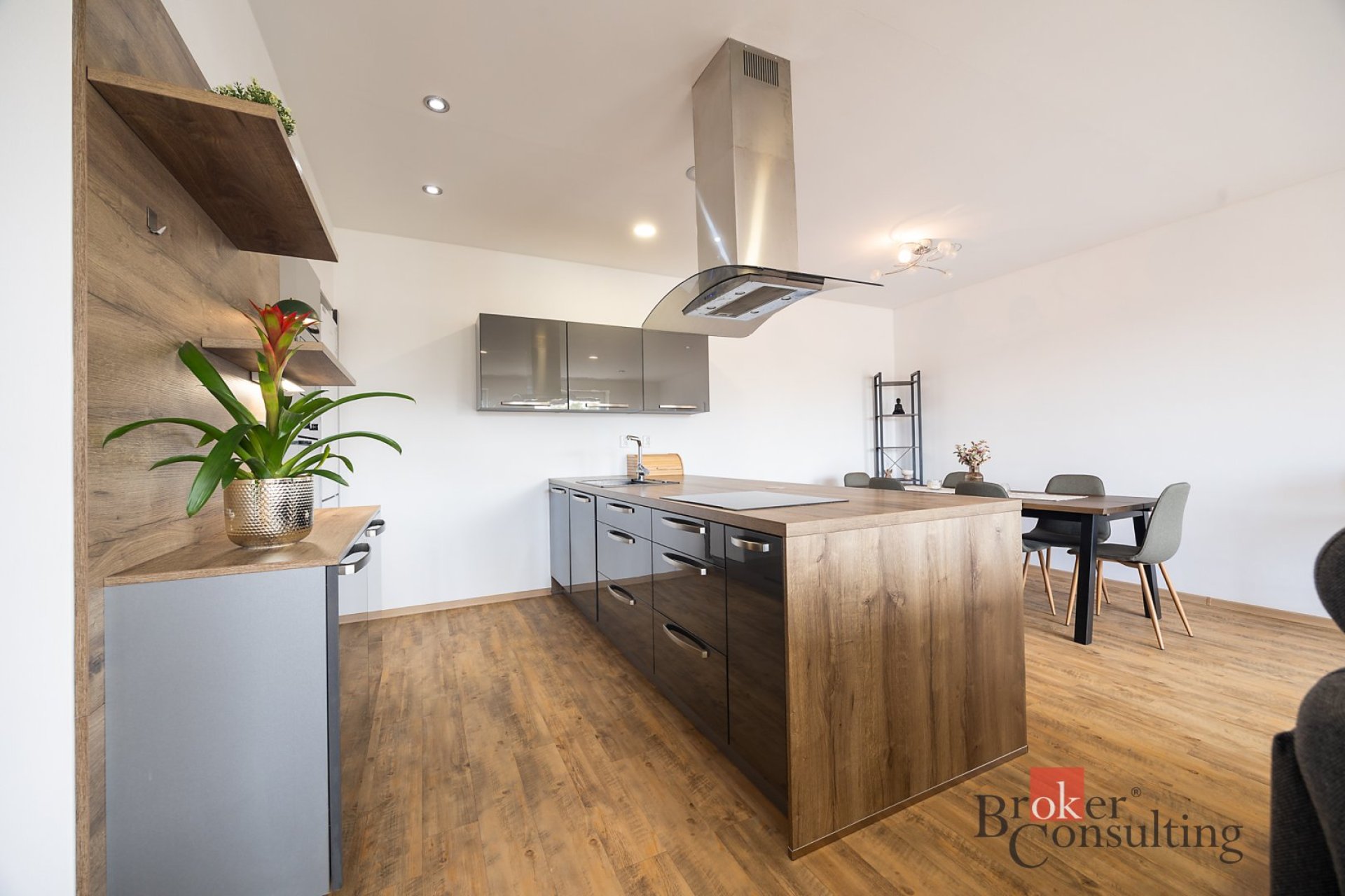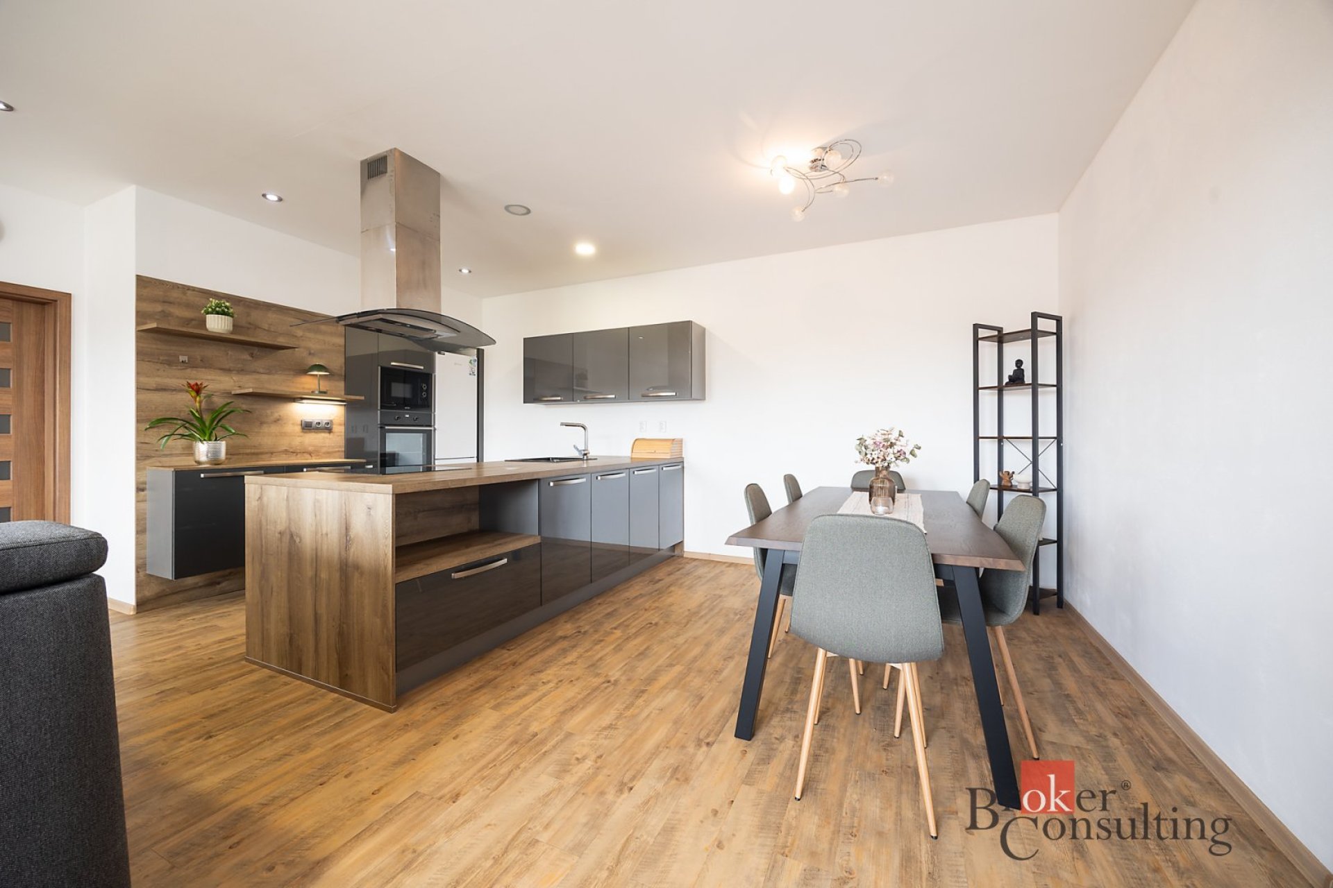 Dominantou bytu je světlý obývací prostor s moderní kuchyní vybavenou vestavnými spotřebiči – lednicí s mrazákem, troubou, mikrovlnnou troubou, myčkou, indukční varnou deskou a digestoří. Kuchyňský ostrůvek nabízí dostatek pracovní plochy i praktického úložného prostoru.
