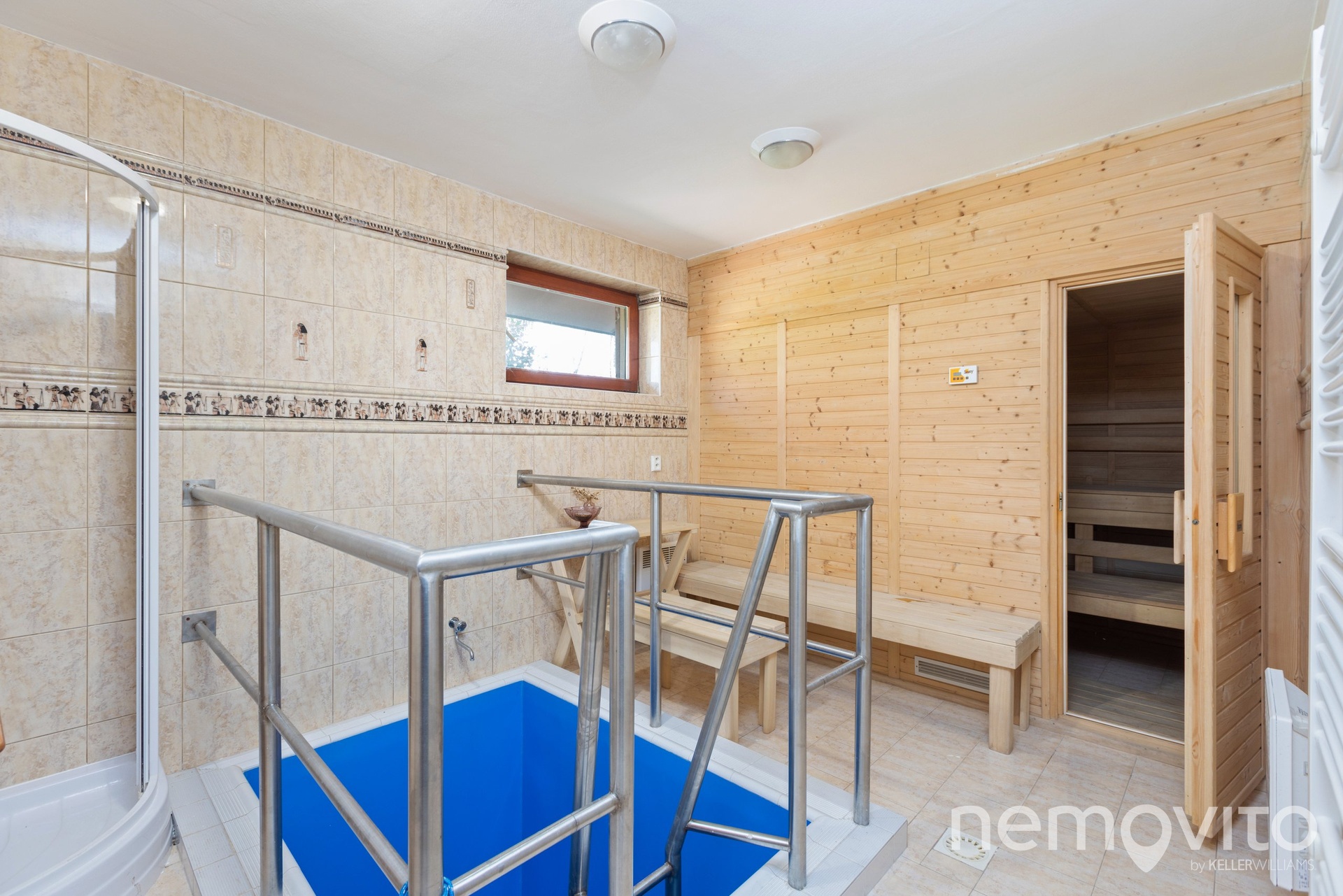 První podlaží tvoří obývací pokoj s jídelnou (24 + 15 m2) a samostatná kuchyně (6 m2). V hlavní části obýváku nechybí krb. Dole se nachází také samostatné WC pod schodištěm a technická místnost s plynovým kotlem, který je přístupný zvenčí. Ve spojovací části domu je zároveň přístup do společného zázemí, které tvoří saunovací místnost (16 m2) a také vstup do garáže (28 m2 celkem, prostor na dvě auta - každý dům má jedno stání).