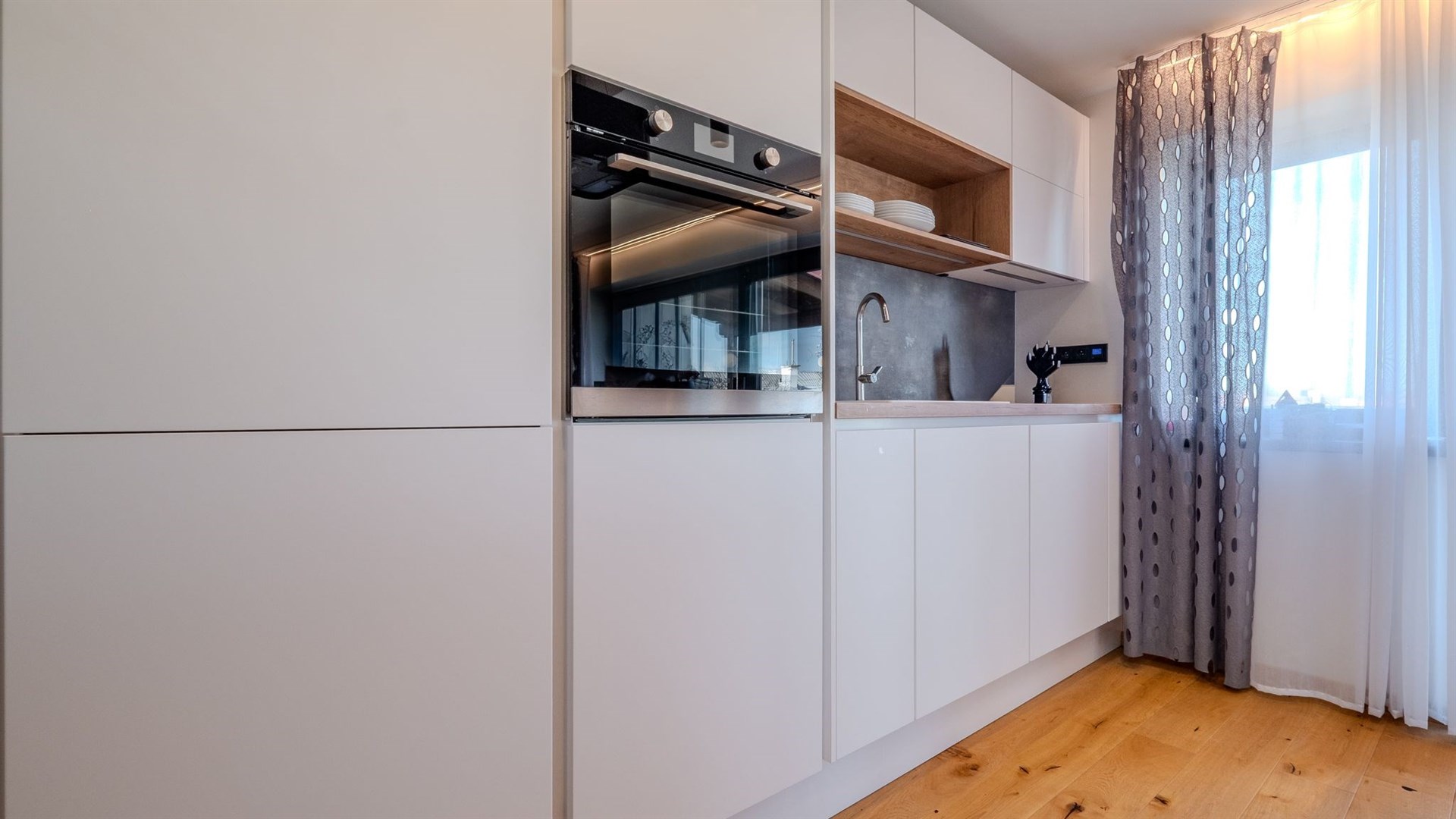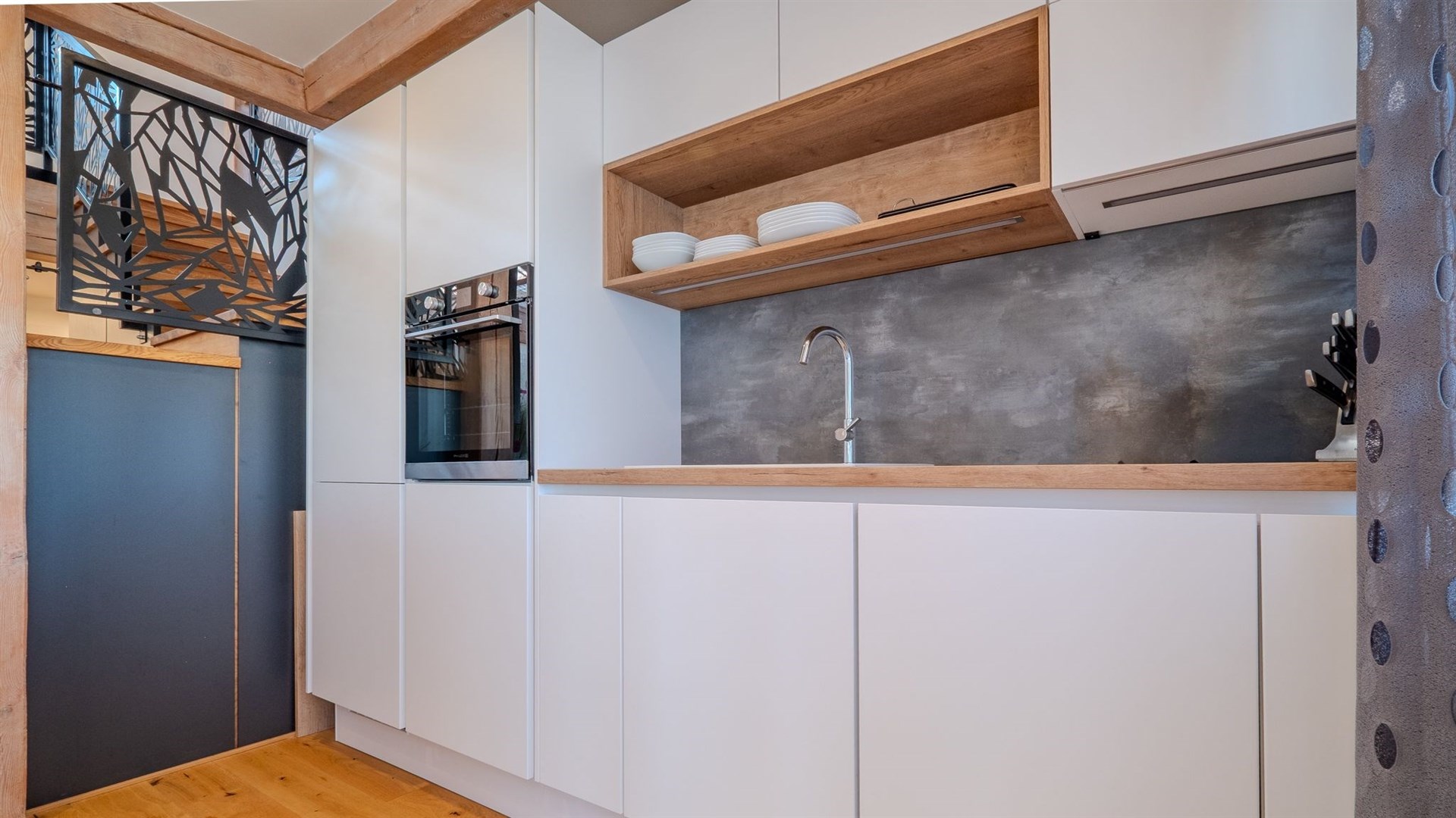 Okna s izolačním trojsklem (REHAU GENEO) zajišťují výbornou tepelnou pohodu, součástí je i bezprahový HS portál na lodžii s přípravou na venkovní stínění. Interiér dotváří designové dveře značky Sapeli se skrytými panty a magnetickými zámky. Součástí bytu je plně vybavená kuchyňská linka.