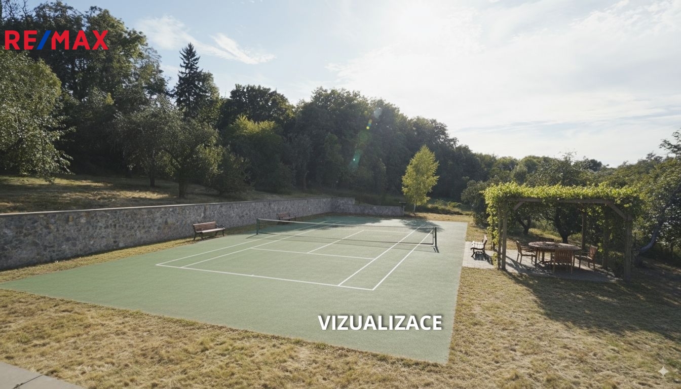 • rovnou plochu vhodnou pro tenisový kurt, zahradní kancelář nebo wellness
