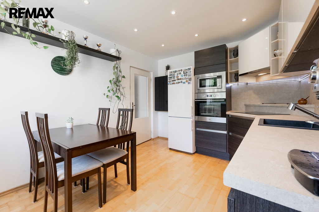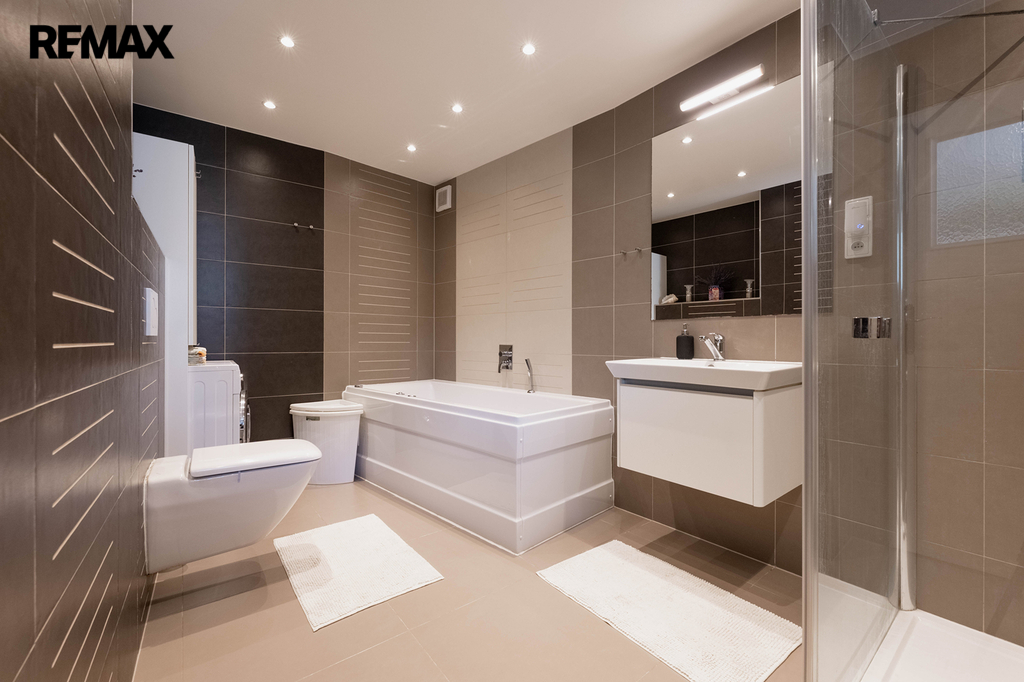 Moderní kuchyň o výměře 12,69m2 s výhledem do dvora, jsou zde zabudované spotřebiče - myčka nádobí, el, trouba, odsavač, indukční varná deska, mikrovlnná trouba, bezúchytkový systém a podsvícení linky, které by zůstávaly součástí prodeje. V koupelně 9.08m2 se nachází podlahové topení, je velmi prostorná, je zde masážní vana, sprchový kout, umyvadlo a WC.