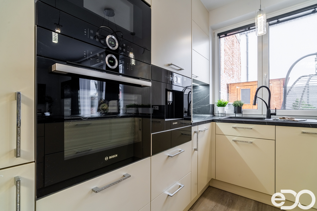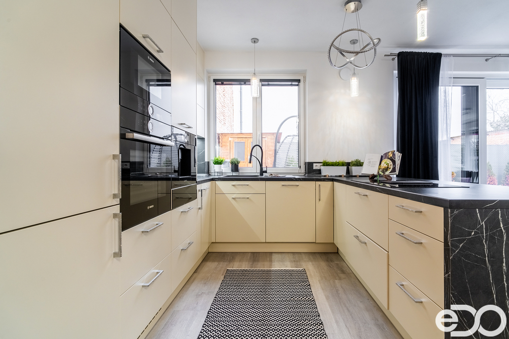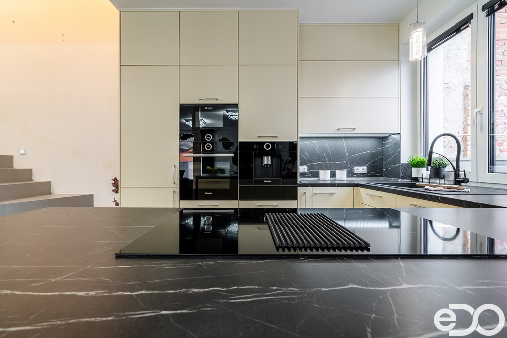 Moderní kuchyňská linka na míru je vybavena všemi vestavěnými spotřebiči – včetně kávovaru, takže si ranní kávu můžete vychutnat rovnou u jídelního stolu.